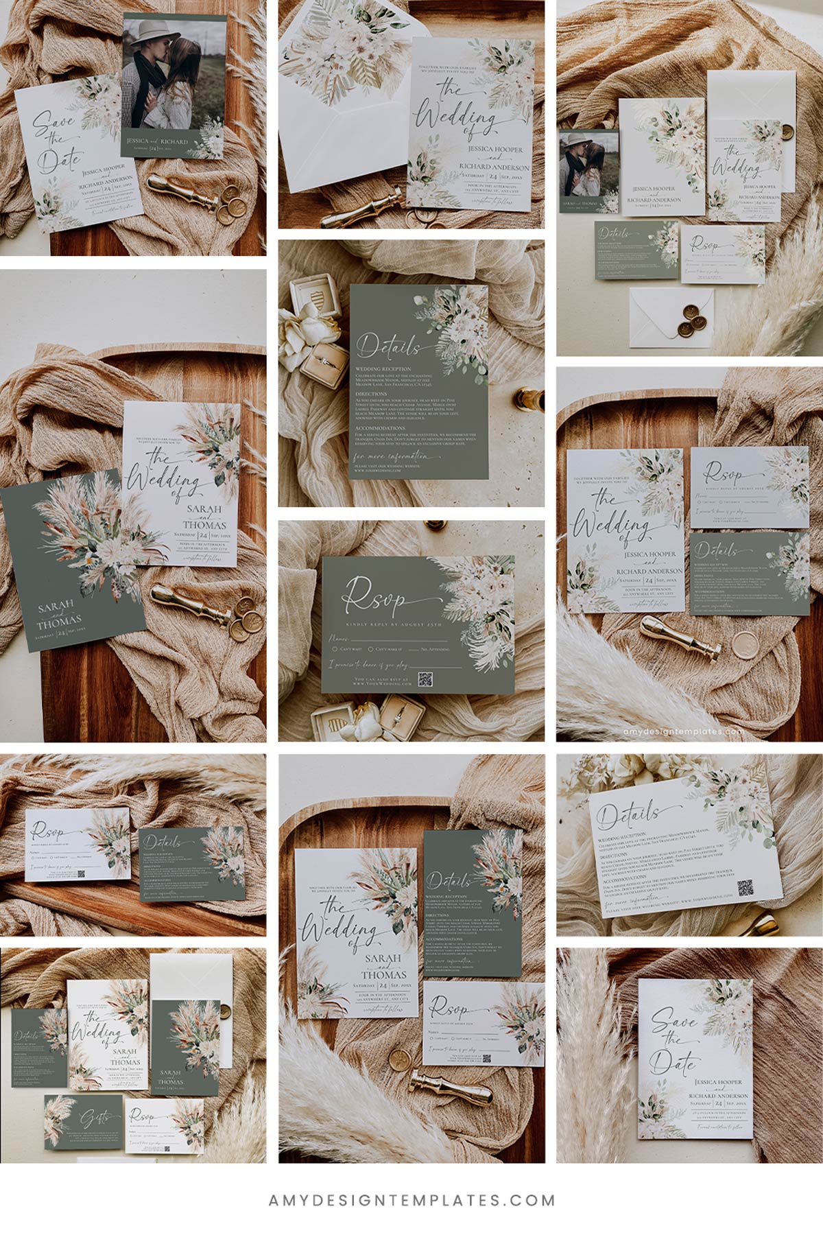 The result is a design that is full of warmth, texture, and a free-spirited, romantic energy. The color palette often deepens to include rich olive or forest green, as seen in the striking details cards, creating a beautiful contrast.