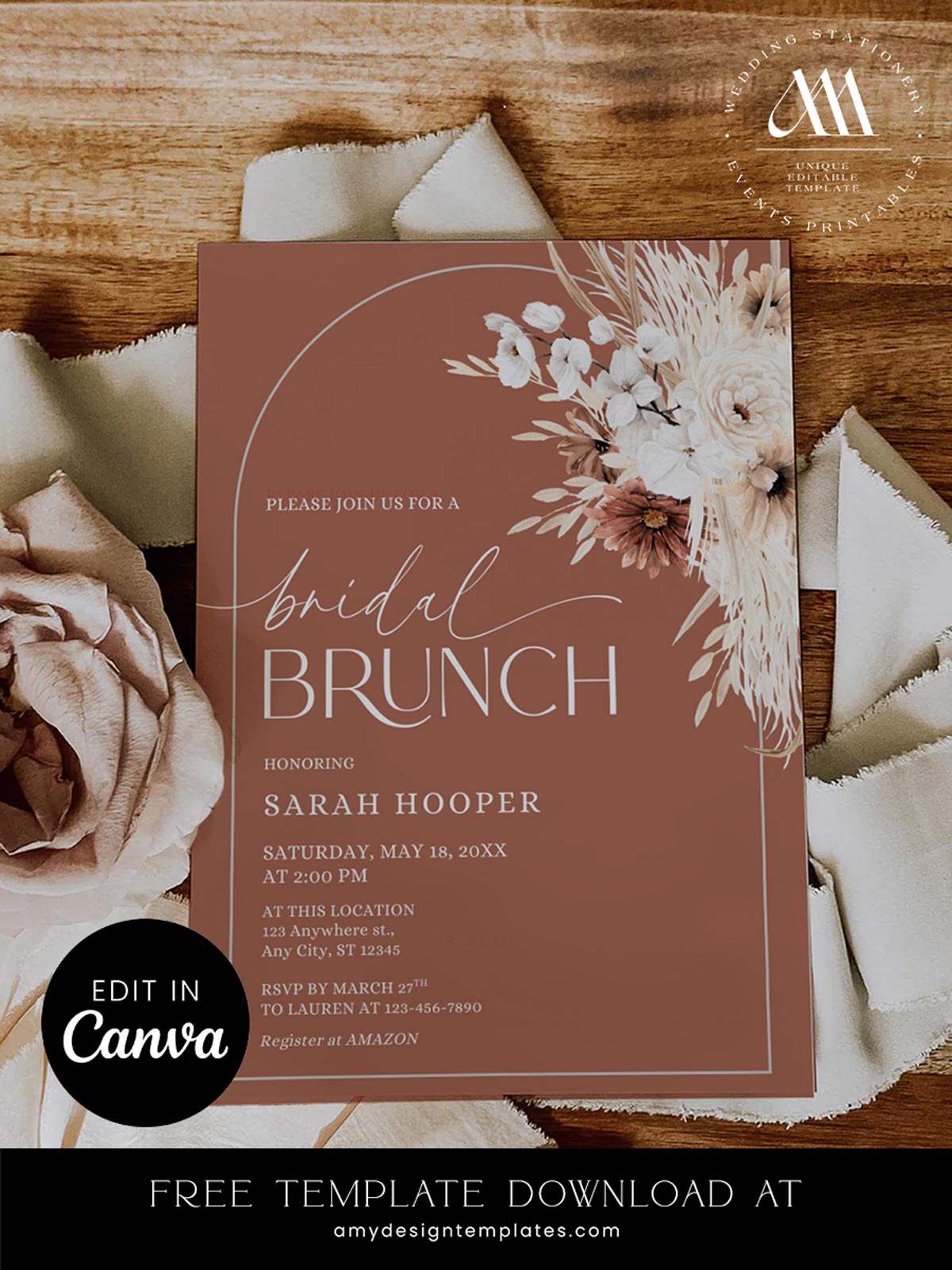 Invite guests to a chic bridal brunch with this modern boho template. Featuring a subtle arched frame, delicate dried palm leaves, and warm rust-toned florals, it’s perfect for a stylish and elegant celebration.