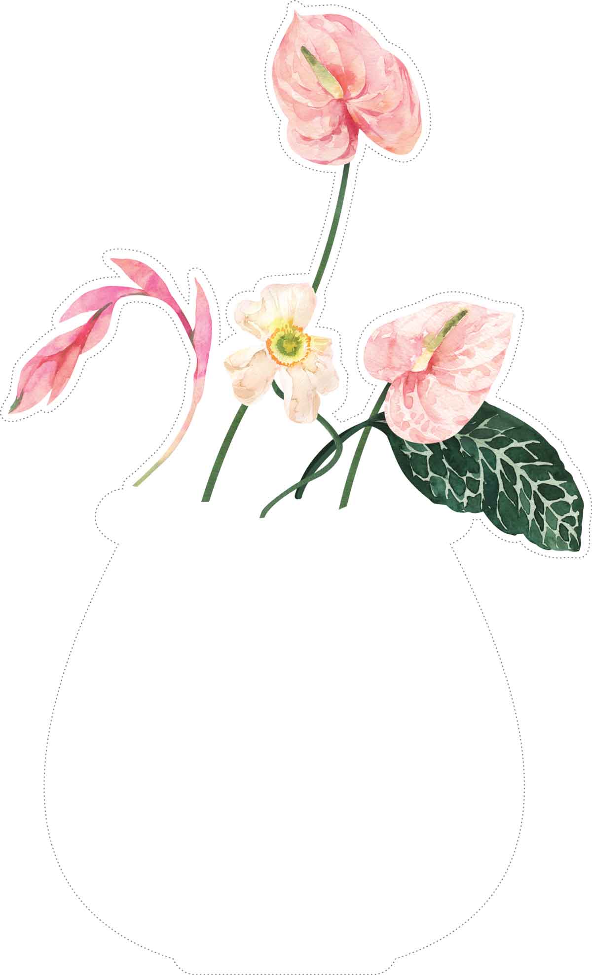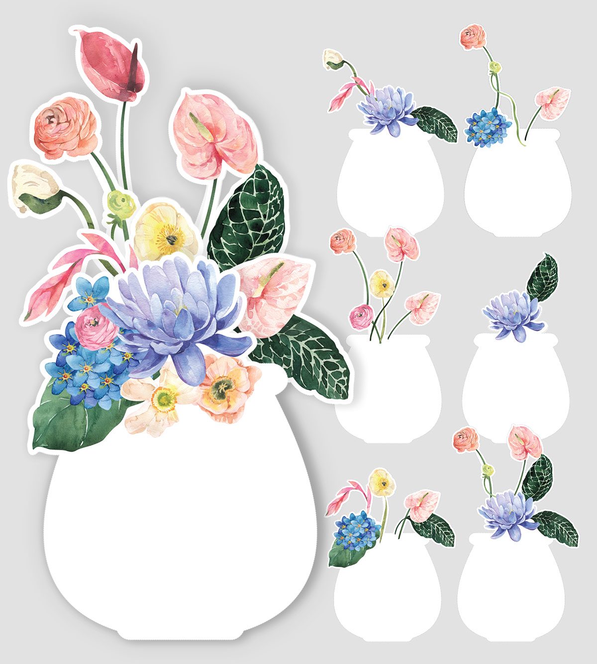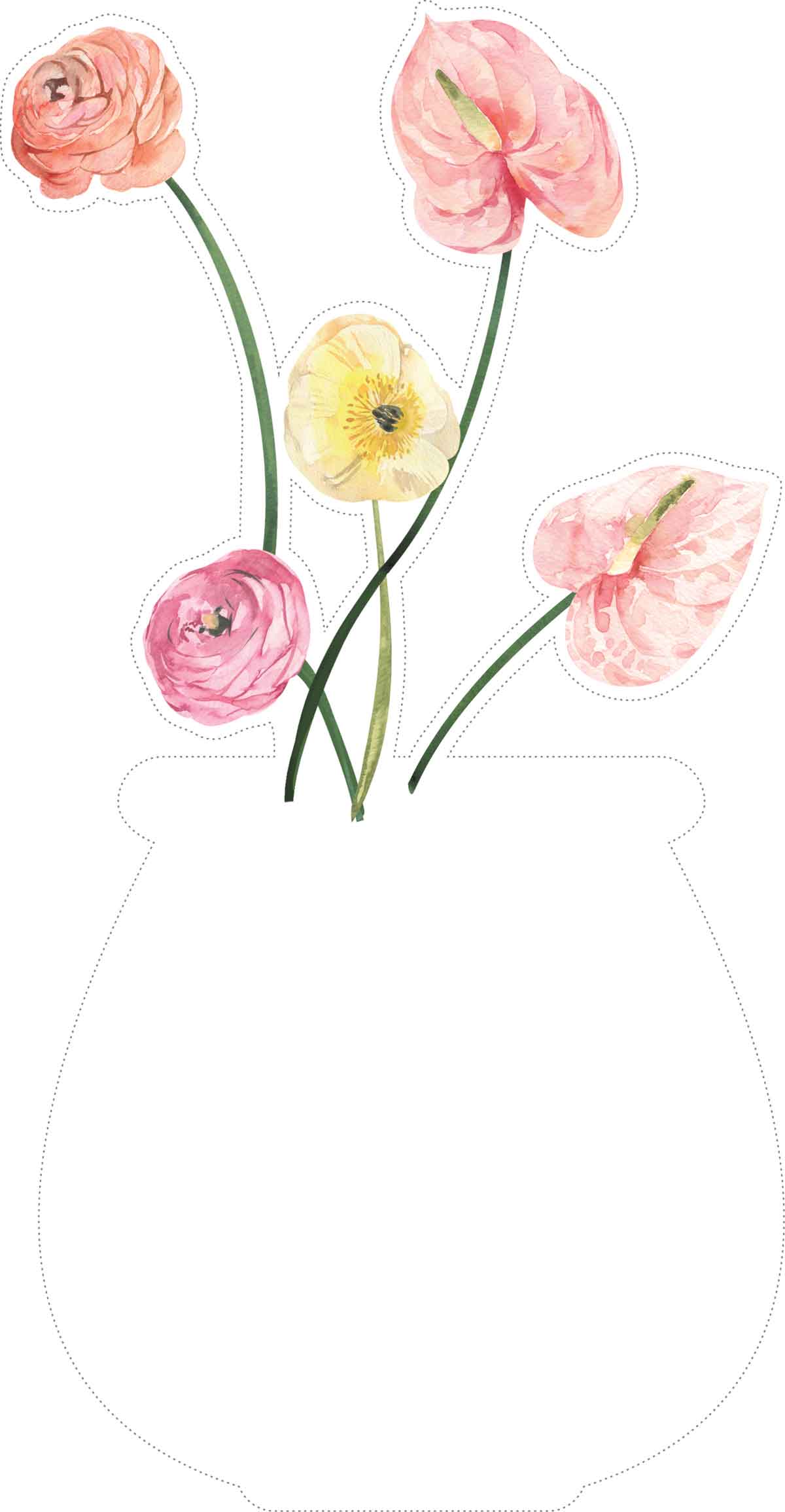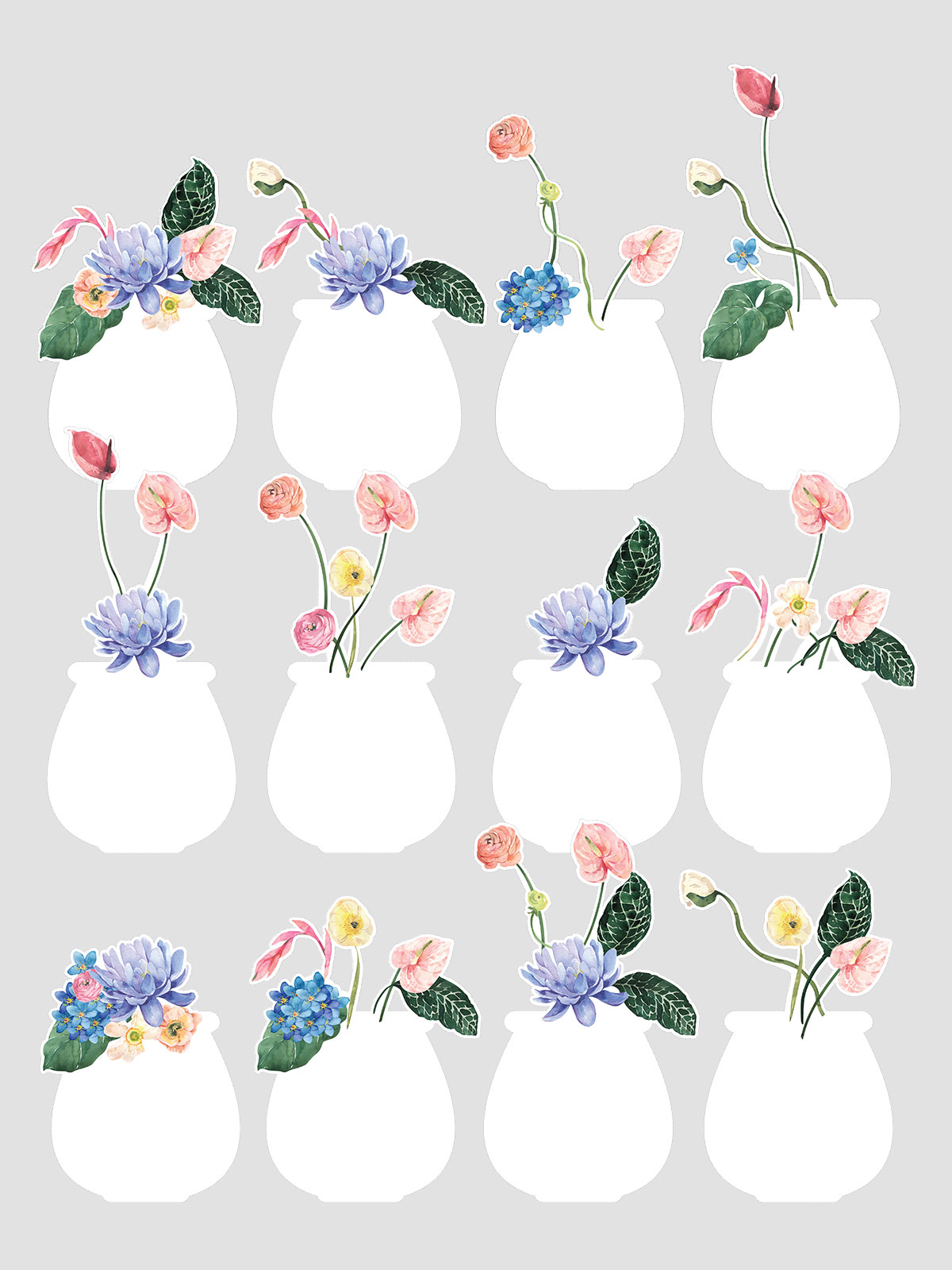 Each of the 12 monthly templates features a distinct watercolor floral arrangement “growing” from a clean, white vase silhouette. The collection showcases a diverse palette of botanical elements: