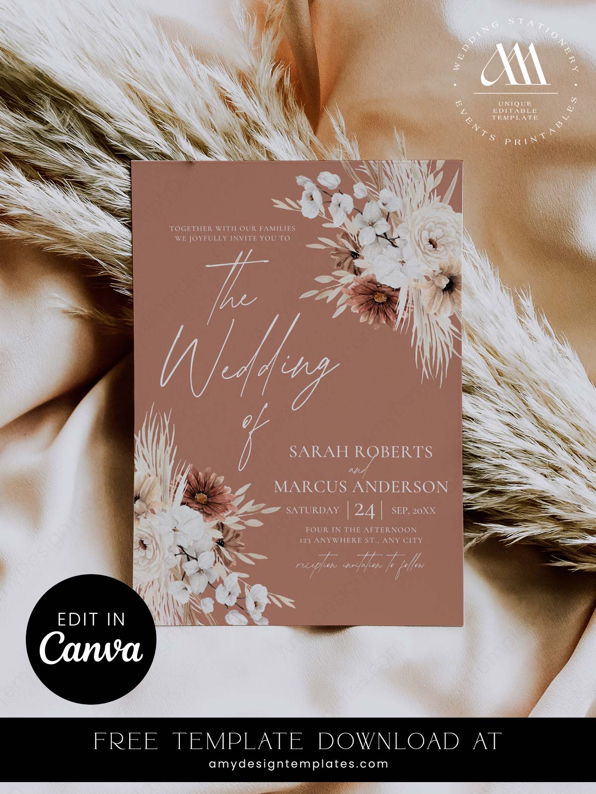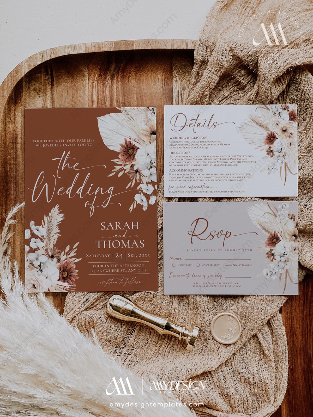 A warm and inviting invitation suite with a rich terracotta background. It’s adorned with beautiful arrangements of dried white and rust-toned florals and pampas grass, creating a chic desert-boho vibe.