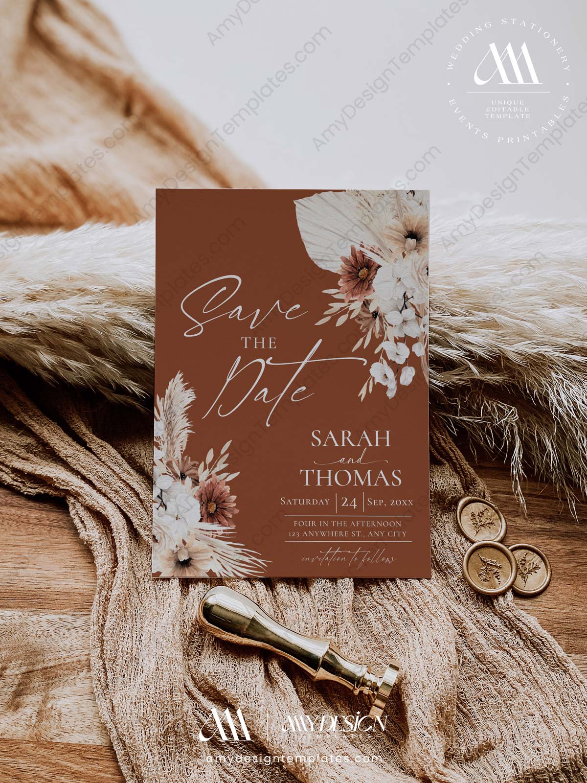 This save the date card carries the same striking terracotta background and dried floral arrangements. One version is a physical card featuring the “Save the Date” text and event details.