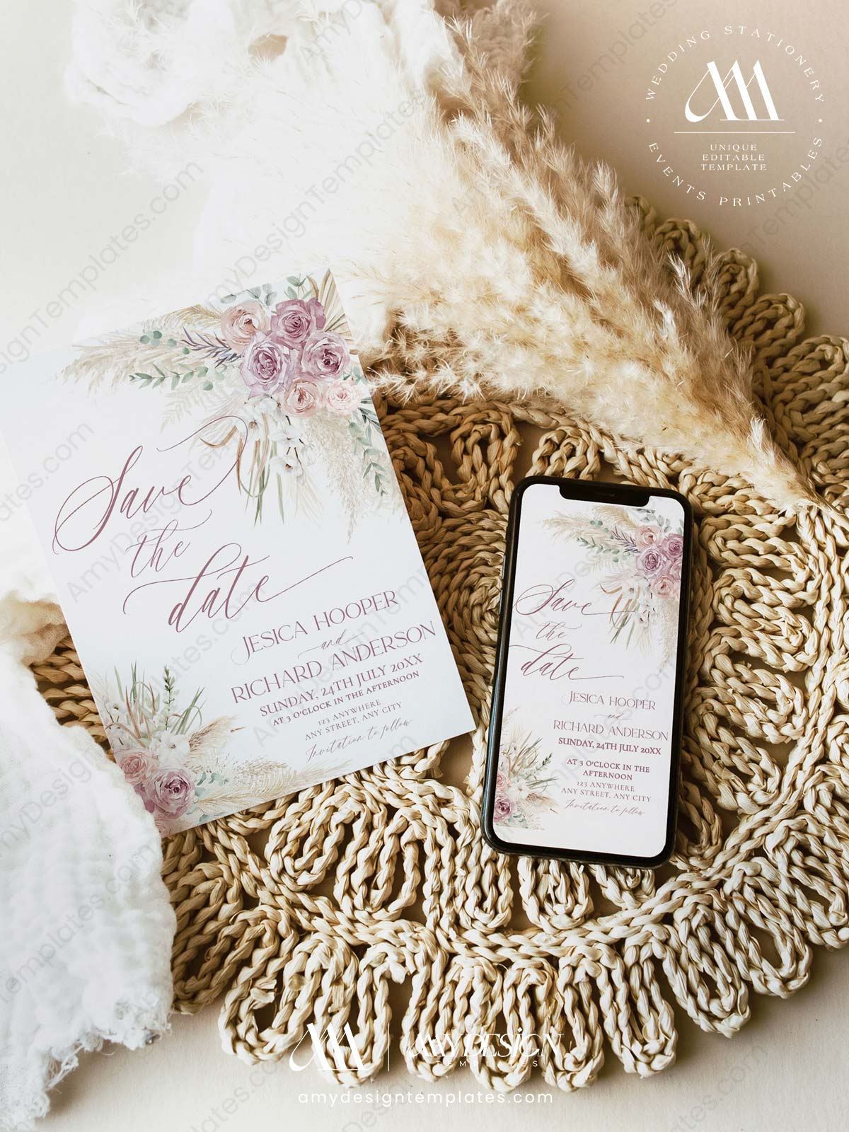 Announce your day with the timeless beauty and soft romance of our Blush Pink Floral Save The Date Card. This elegant template collection captures the heart of a modern rustic wedding, blending lush, romantic florals with the gentle, free-spirited texture of pampas grass.