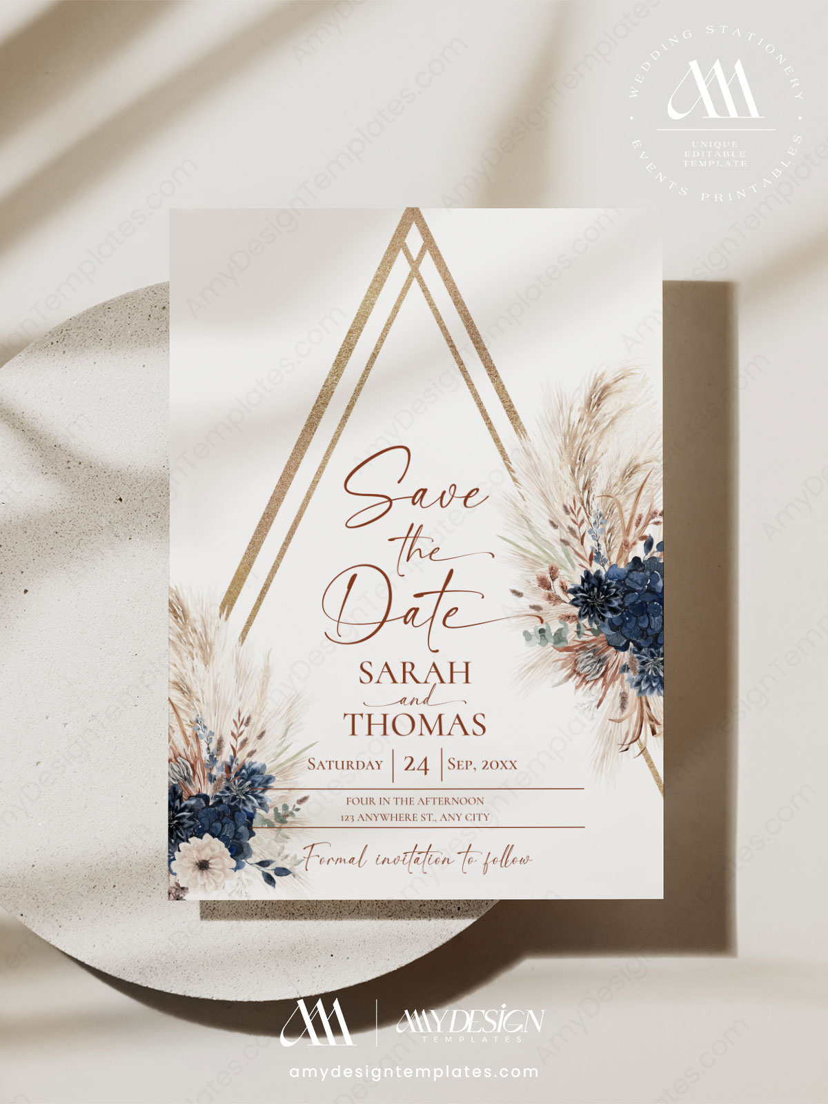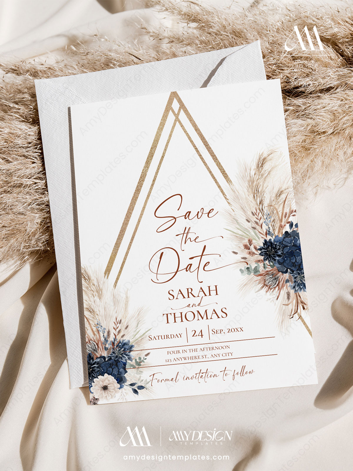 Included in this Bohemian Navy Wedding Save The Date Card Template