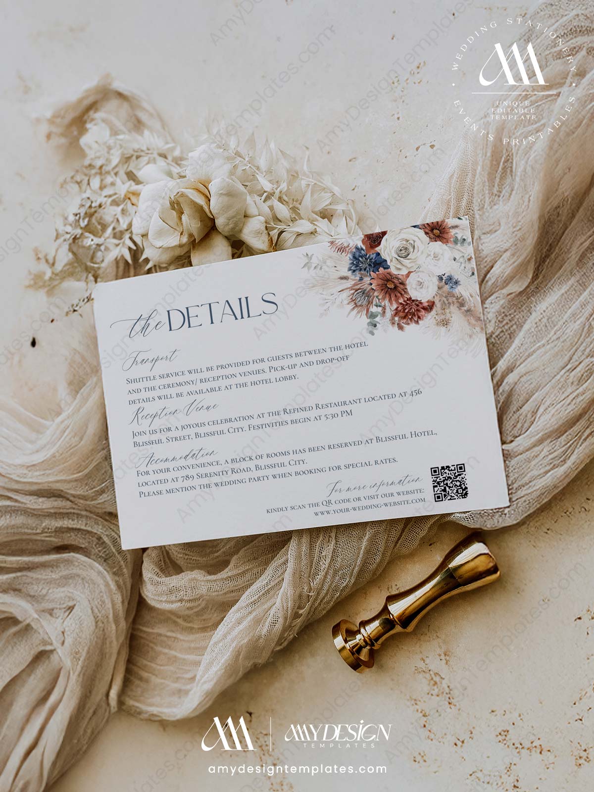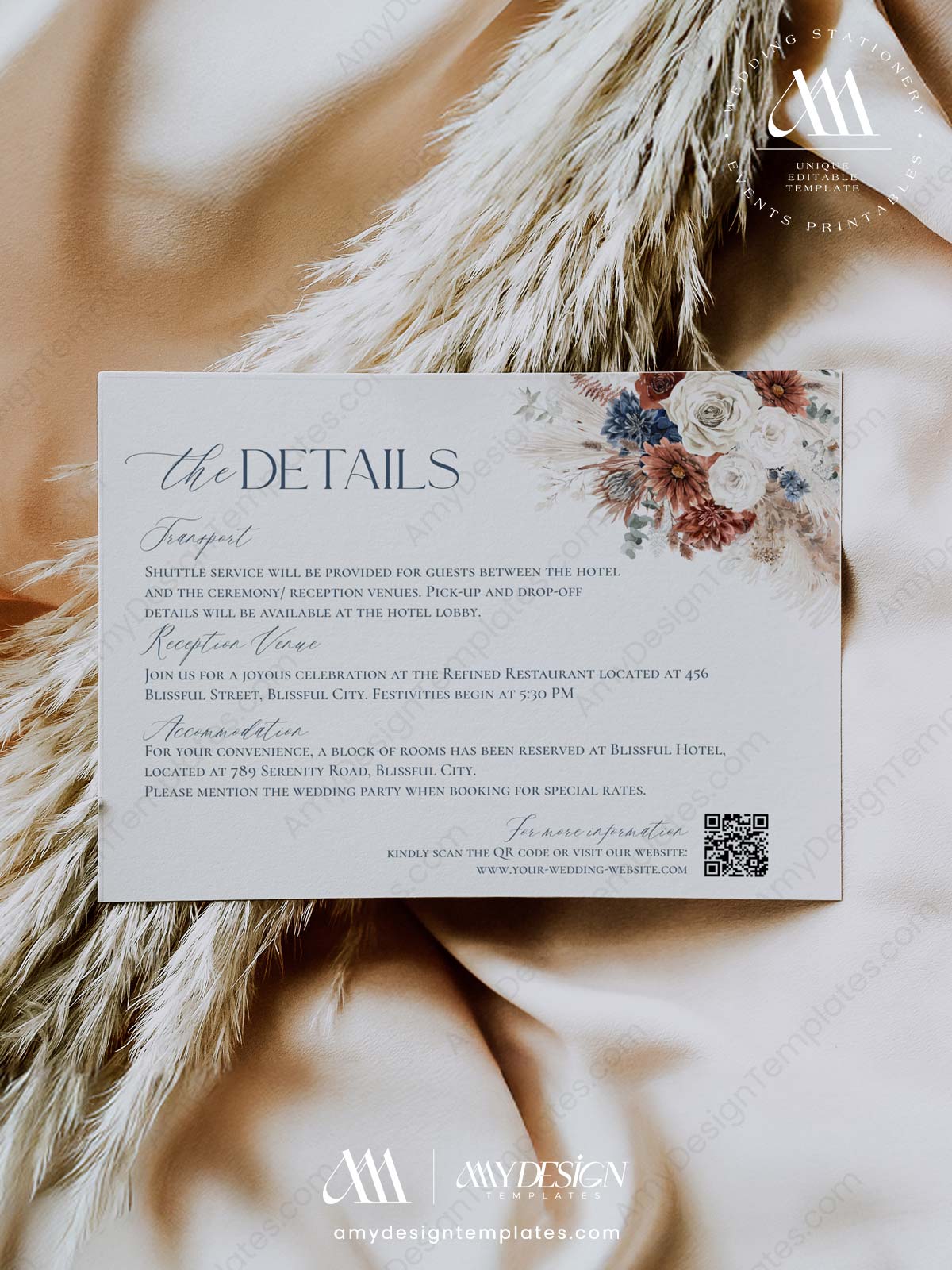 Boho Navy Blue and Rust Wedding Details Card Template | Wedding Enclosure Card Printable