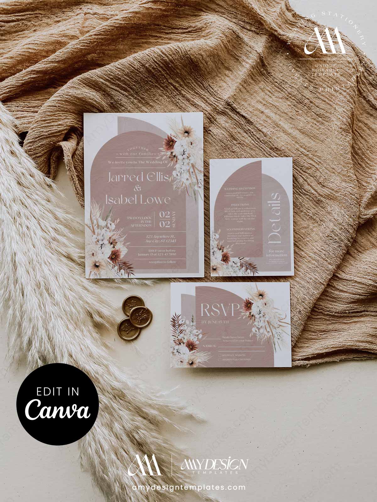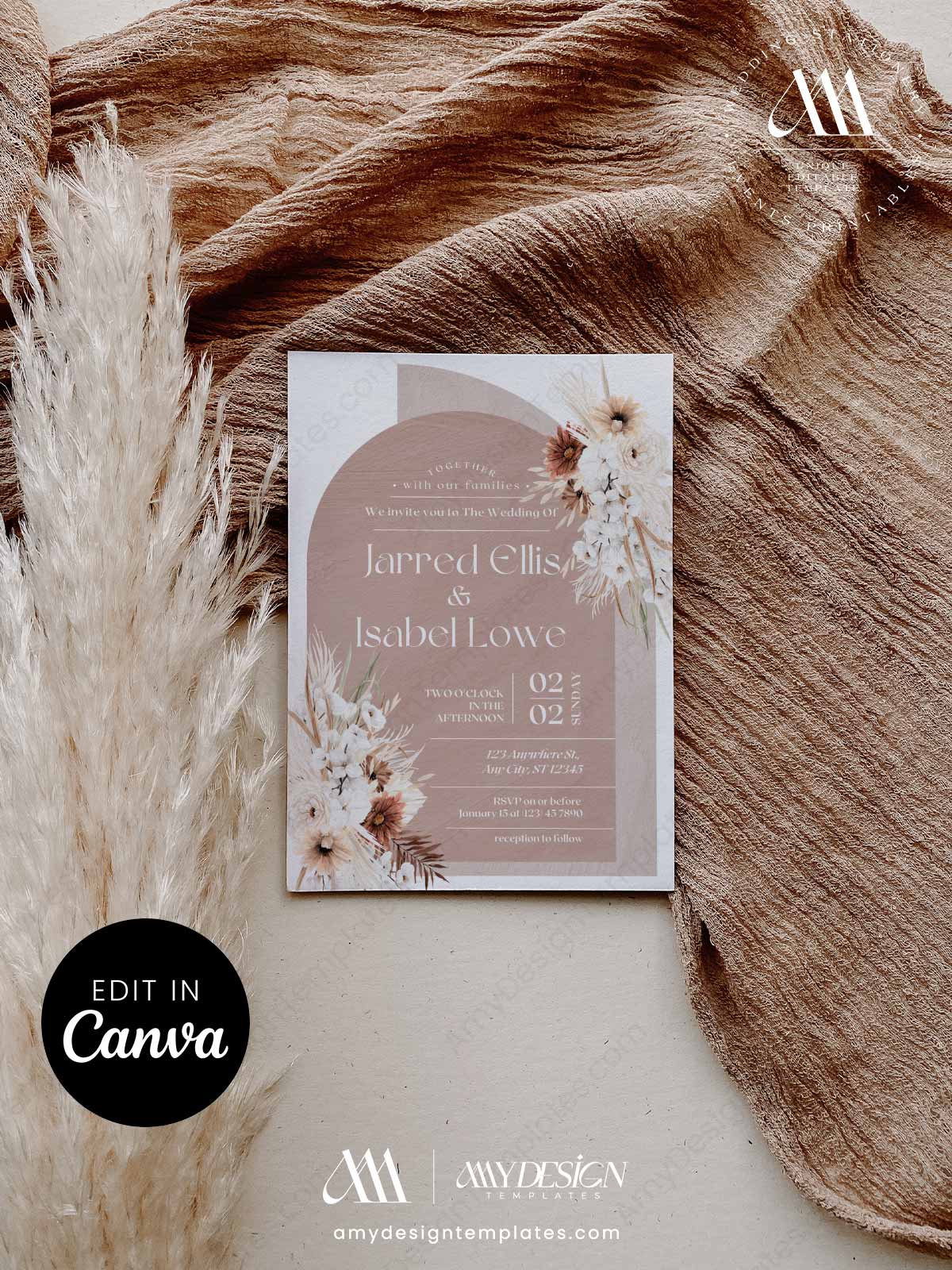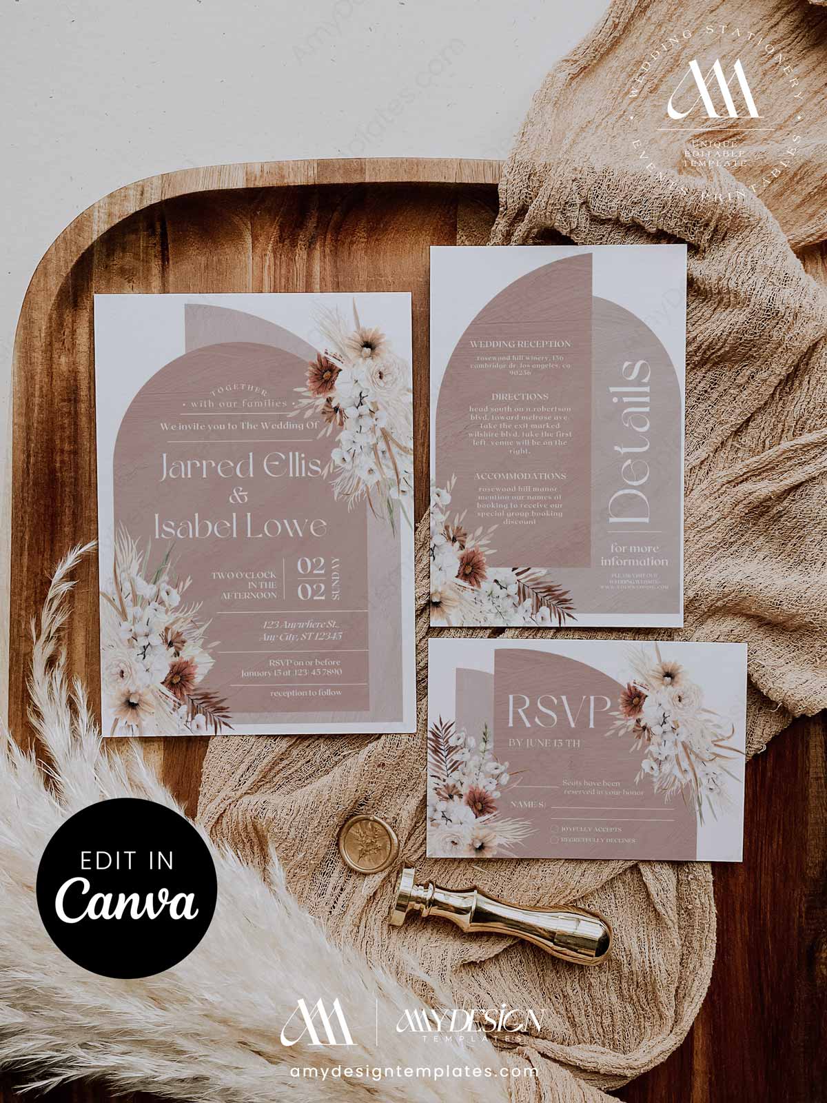 Boho Terracotta Wedding Invitation Canva Template | Arch Bohemian Invite Set Printable