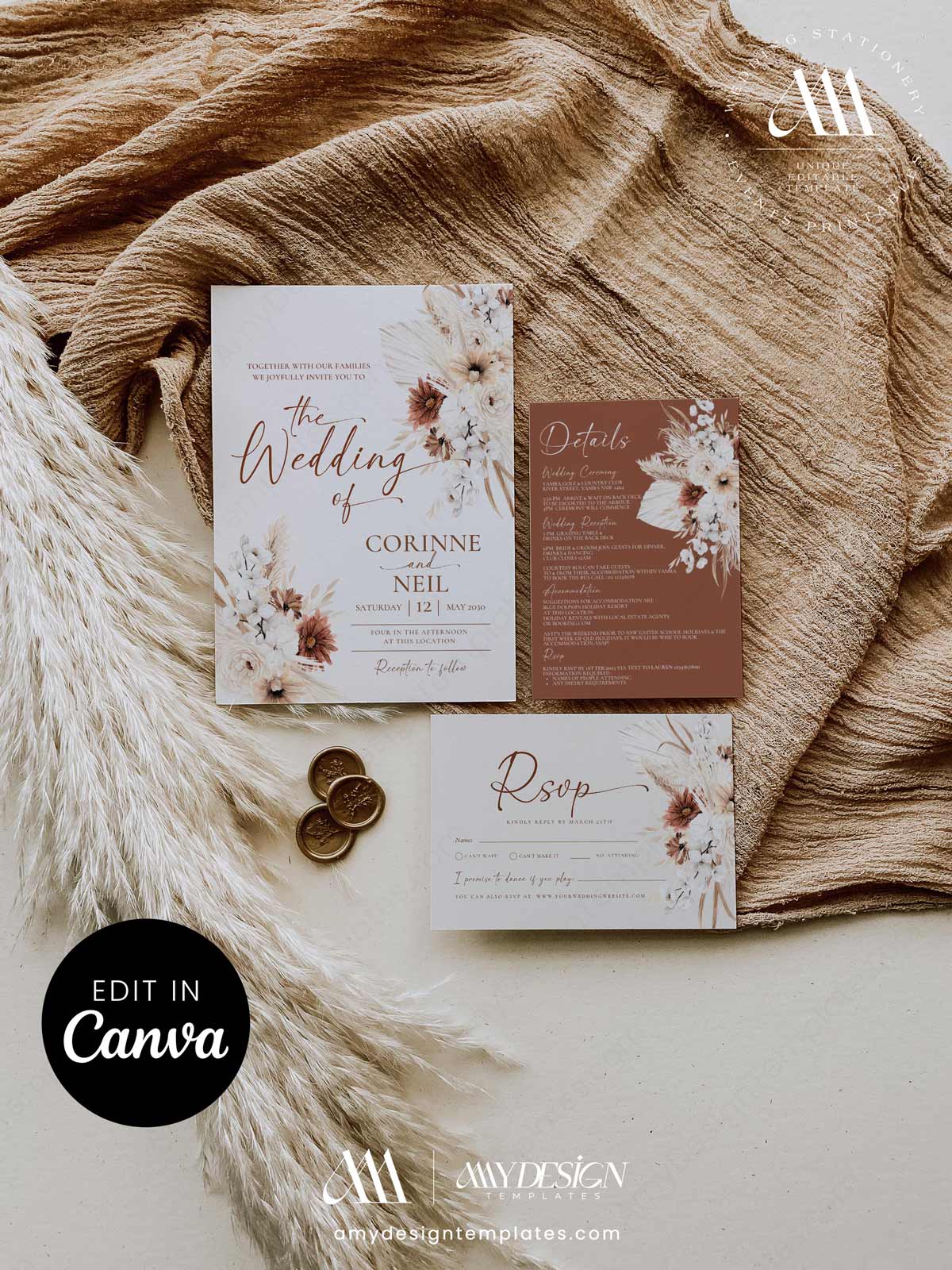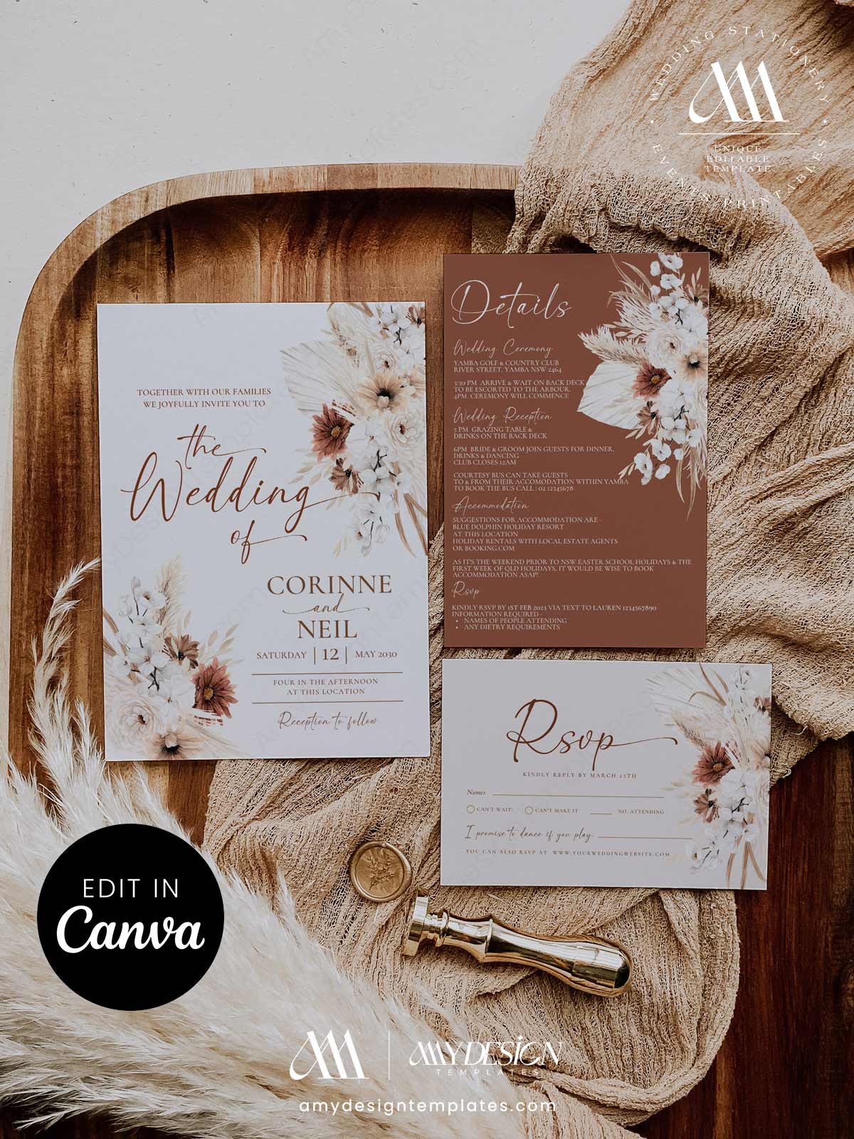 Boho Wedding Invitations Template Canva | Rustic Terracotta Invitation Set Printable