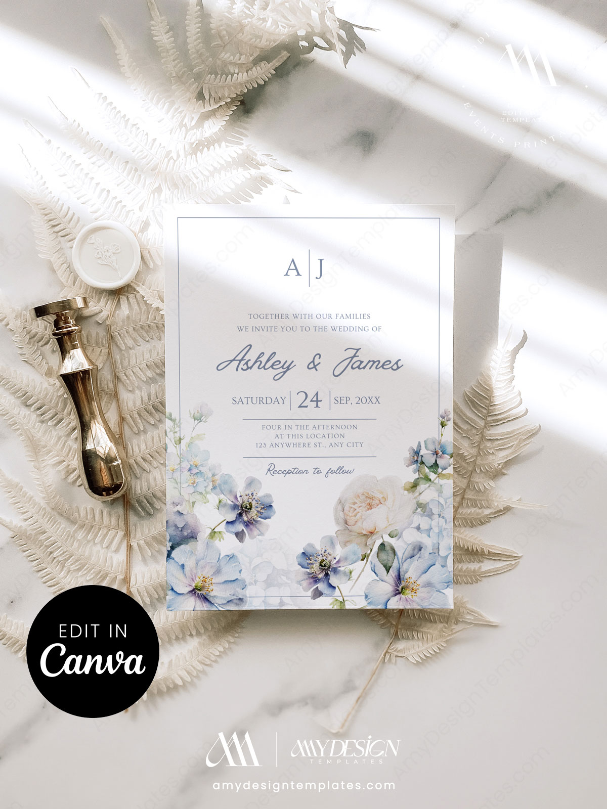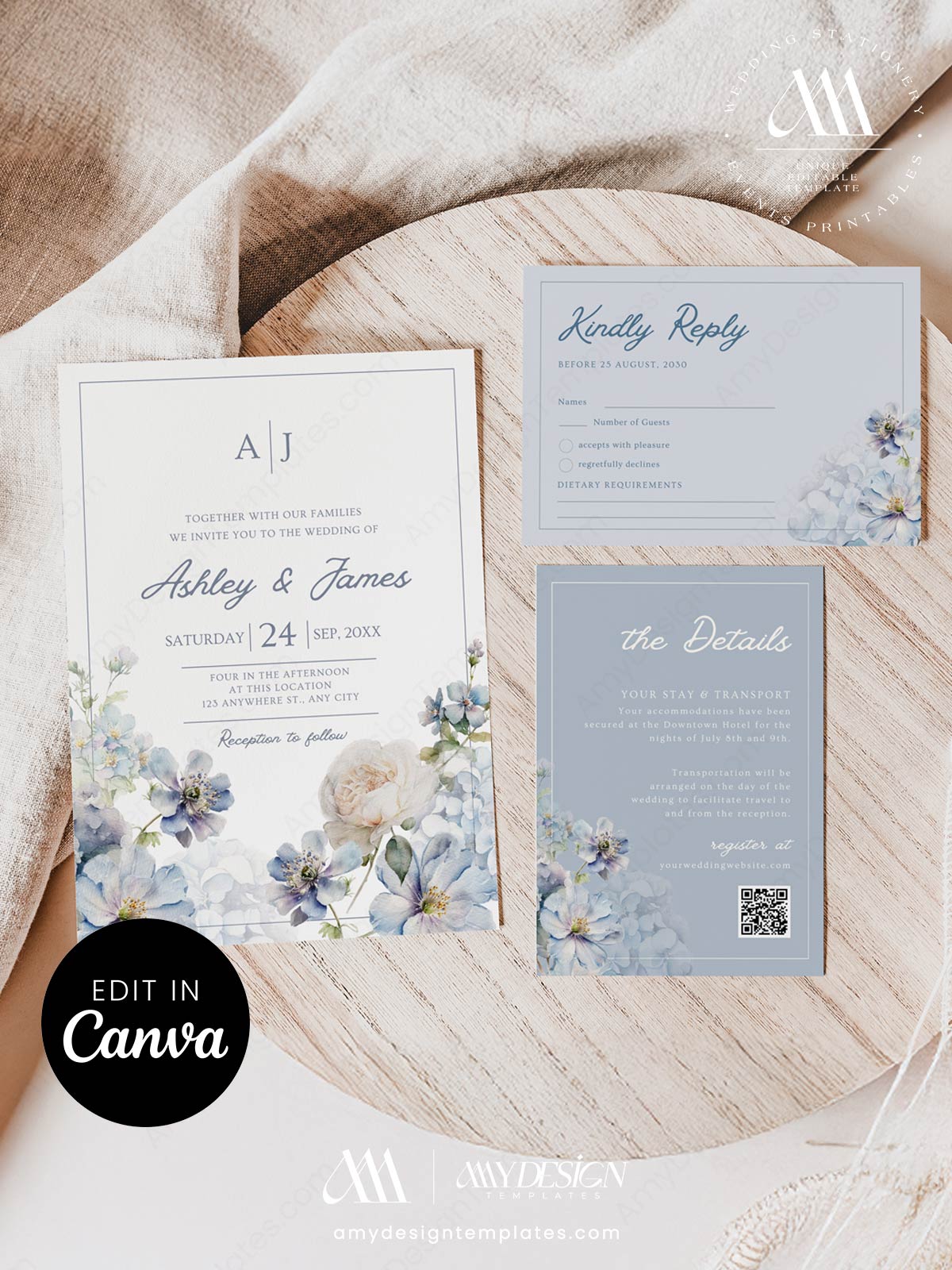 Dusty Blue Floral Wedding Invitation Canva Template | Editable Romantic Wedding Suite
