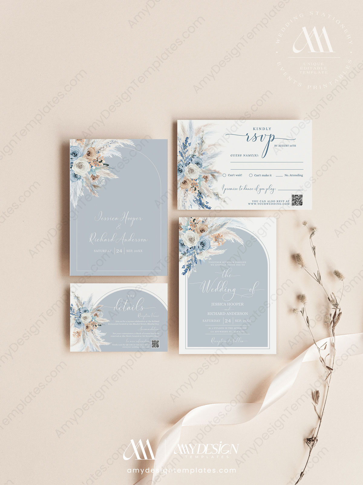 Dusty Blue Wedding Invitation Suite | Blue Wedding Template | Boho Arched