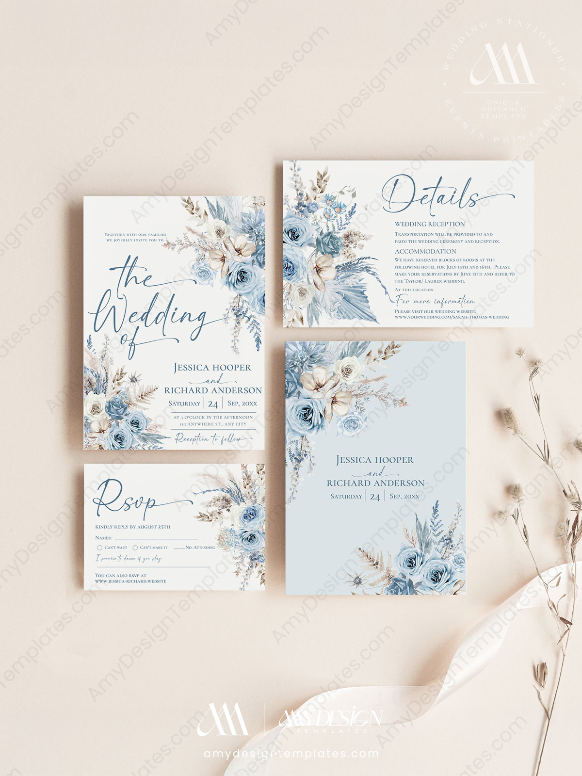 Announce your special day with the serene and dreamy charm of our Dusty Blue Wedding Invitation Template Set. This printable template suite captures the light, ethereal beauty of a modern boho romance, blending soft, airy blues with natural, earthy textures.