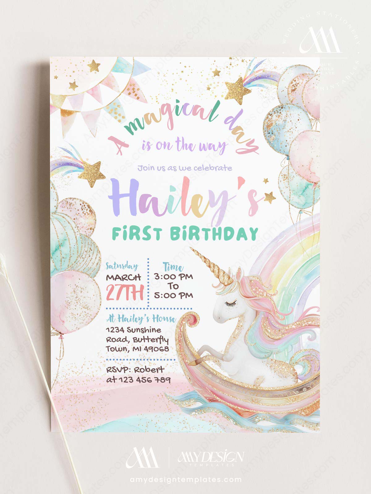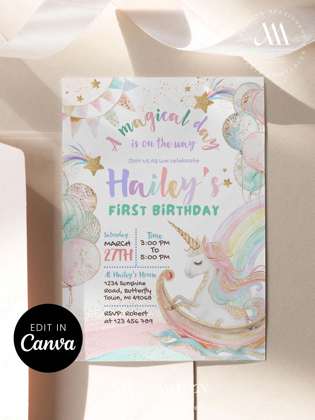 Editable Unicorn Moon Boat Birthday Invite Printable | Dreamy Crescent Party Kid Girls Birthday Party | Editable Canva Template