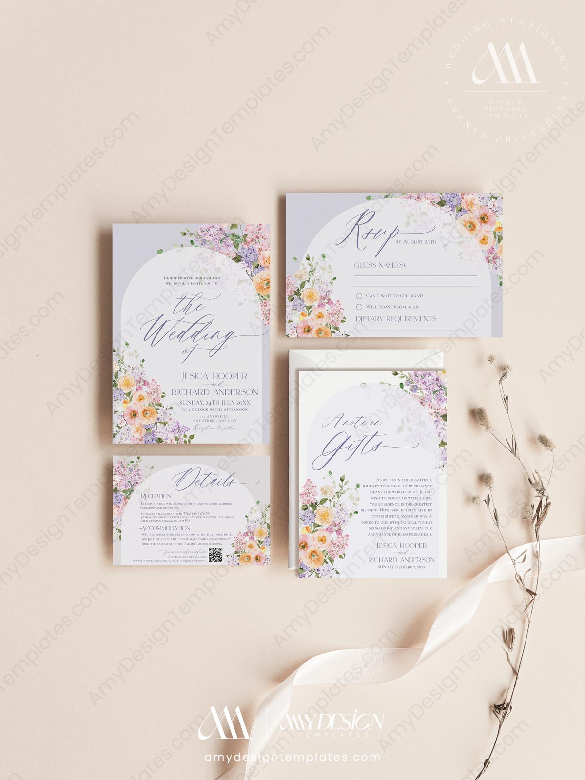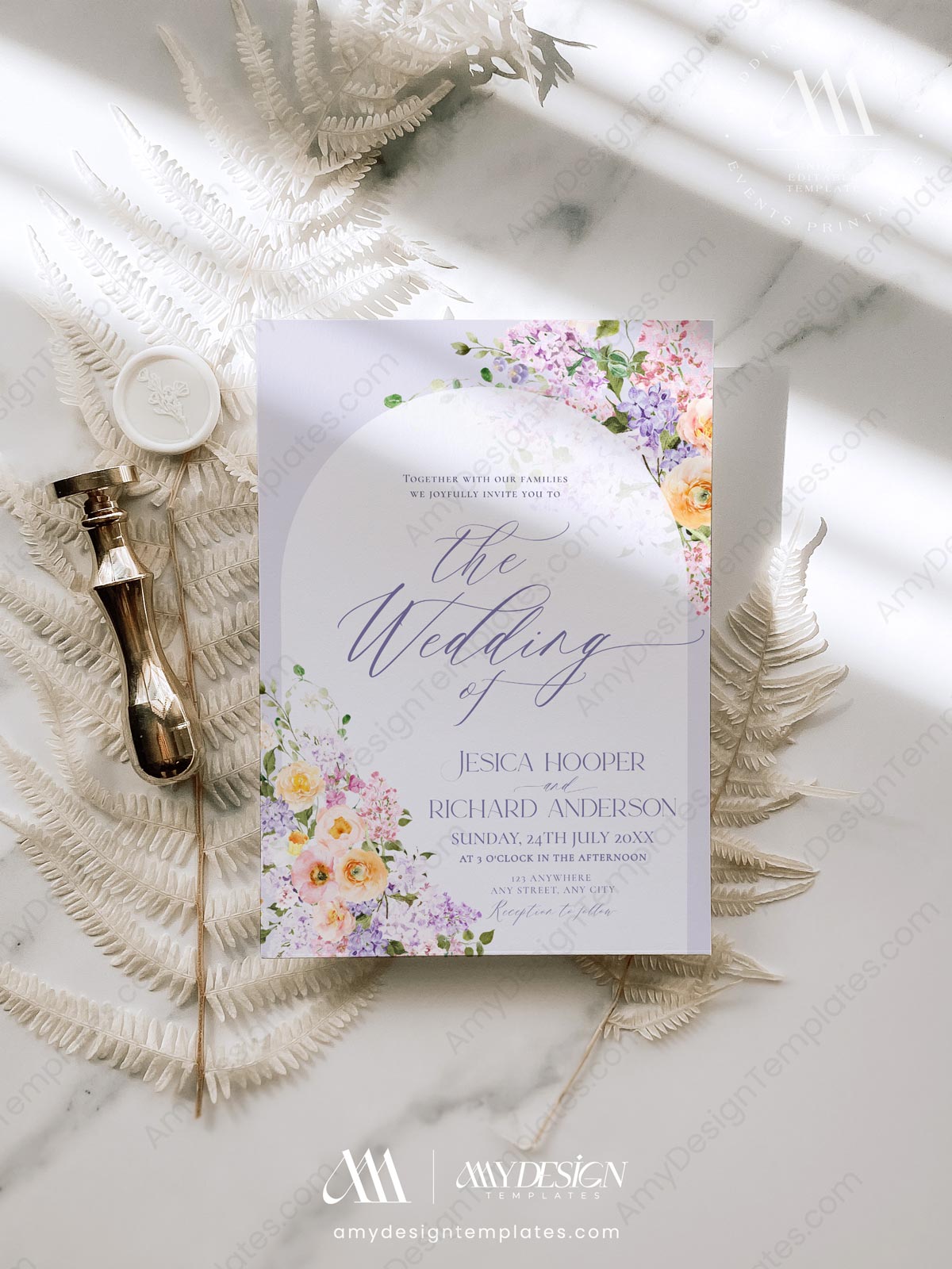 Set a romantic tone with this Floral Wedding Invitation Card Printable by Amy Design. This beautiful Purple Peach Wedding Invite Template features a dreamy blend of watercolor lilac and peach florals, framed by an elegant arch for a whimsical, garden-fresh feel. Start your free demo: Experience our template editor!