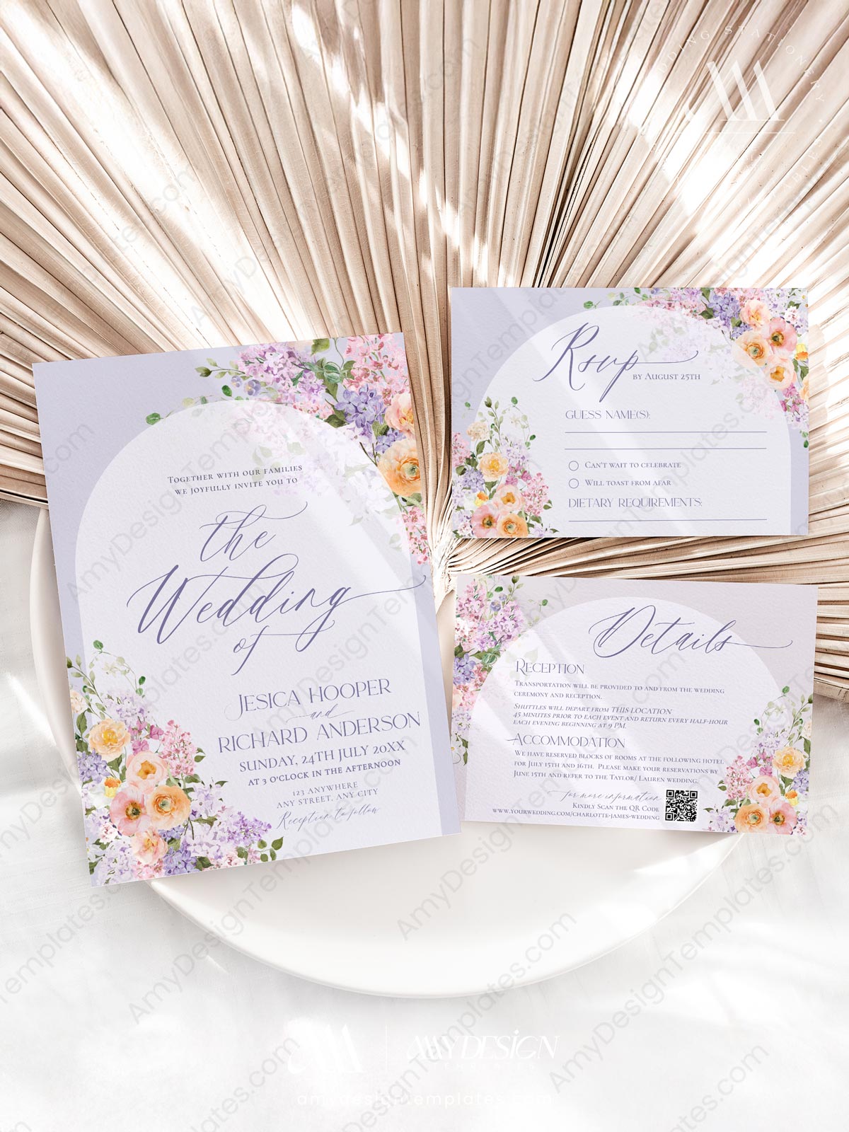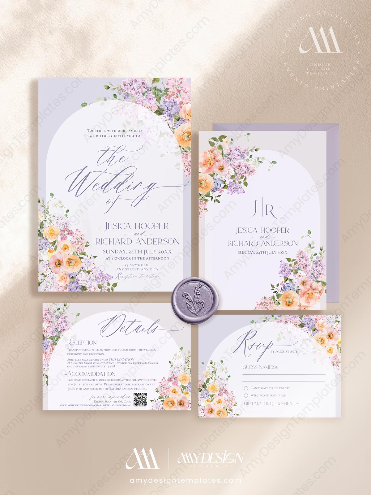 Floral Wedding Invitation Card Printable | Purple Peach Wedding Invite Template