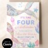 Dive into a world of magic and sparkle with the Girl Mermaids Birthday Party Invitation Canva Template by Amy Design. This enchanting design captures the beauty of the sea with shimmering, glitter-accented mermaid tails and playful sea creatures decked out in festive party hats.