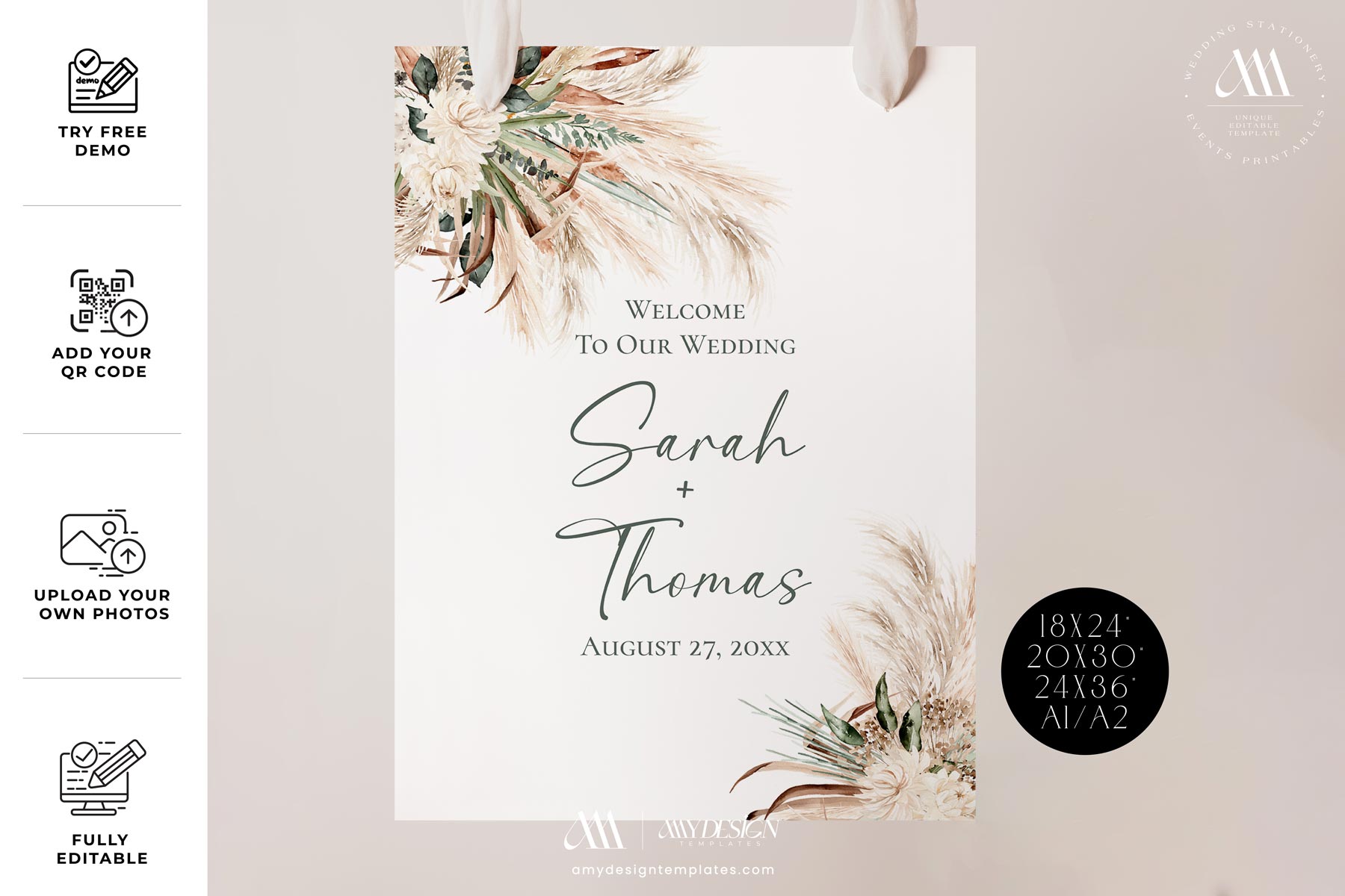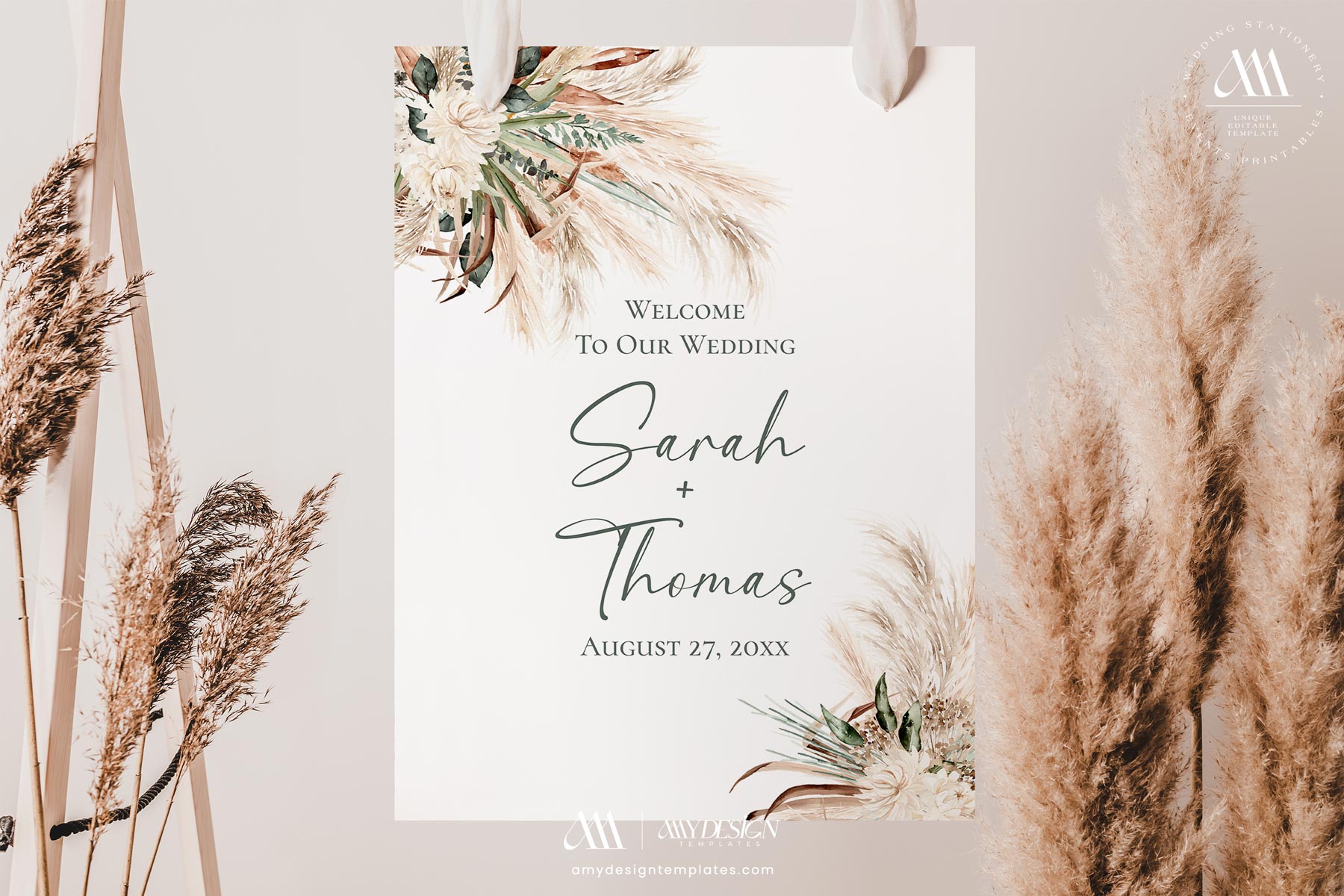 Greenery Pampas Wedding Welcome Sign | Boho Wedding DIY Printable Template