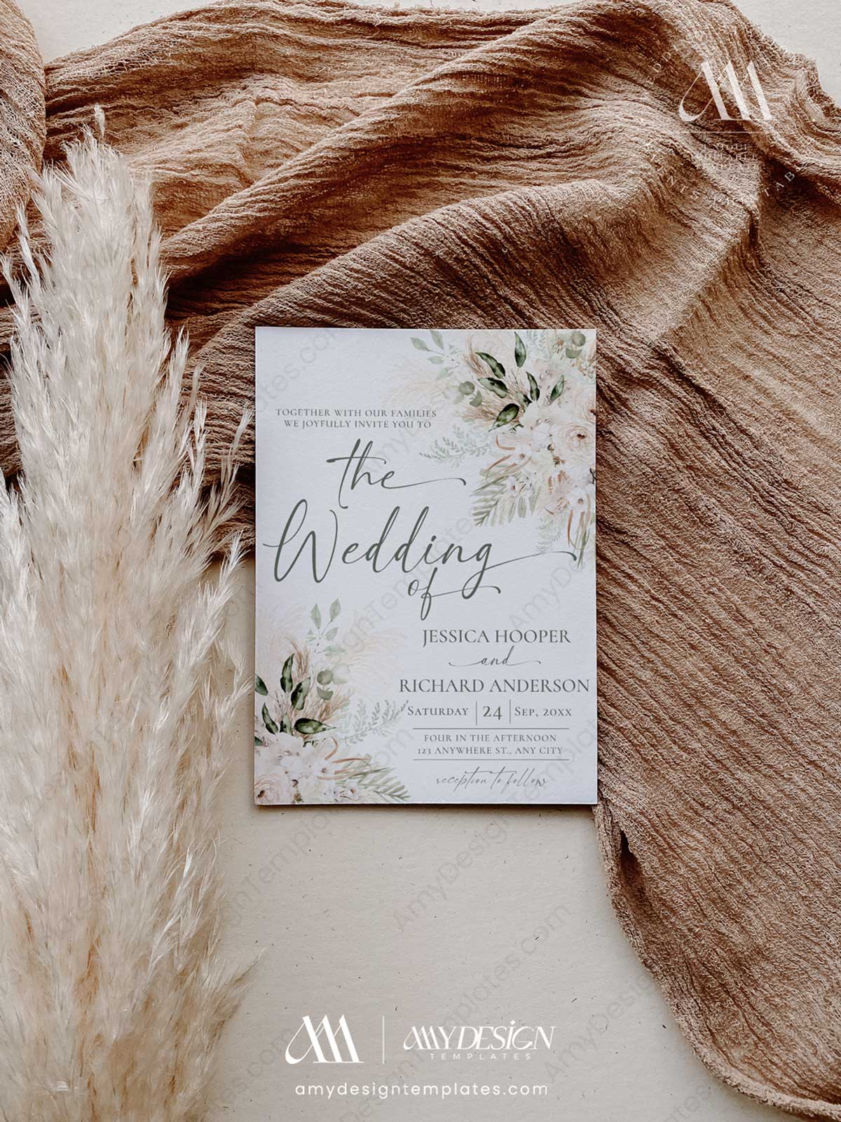 Announce your special day with the serene elegance and natural beauty of our Greenery Wedding Invitation Card. This printable greenery collection captures the heart of a modern rustic romance, blending sophisticated, earthy greens with the soft, wild texture of pampas grass.