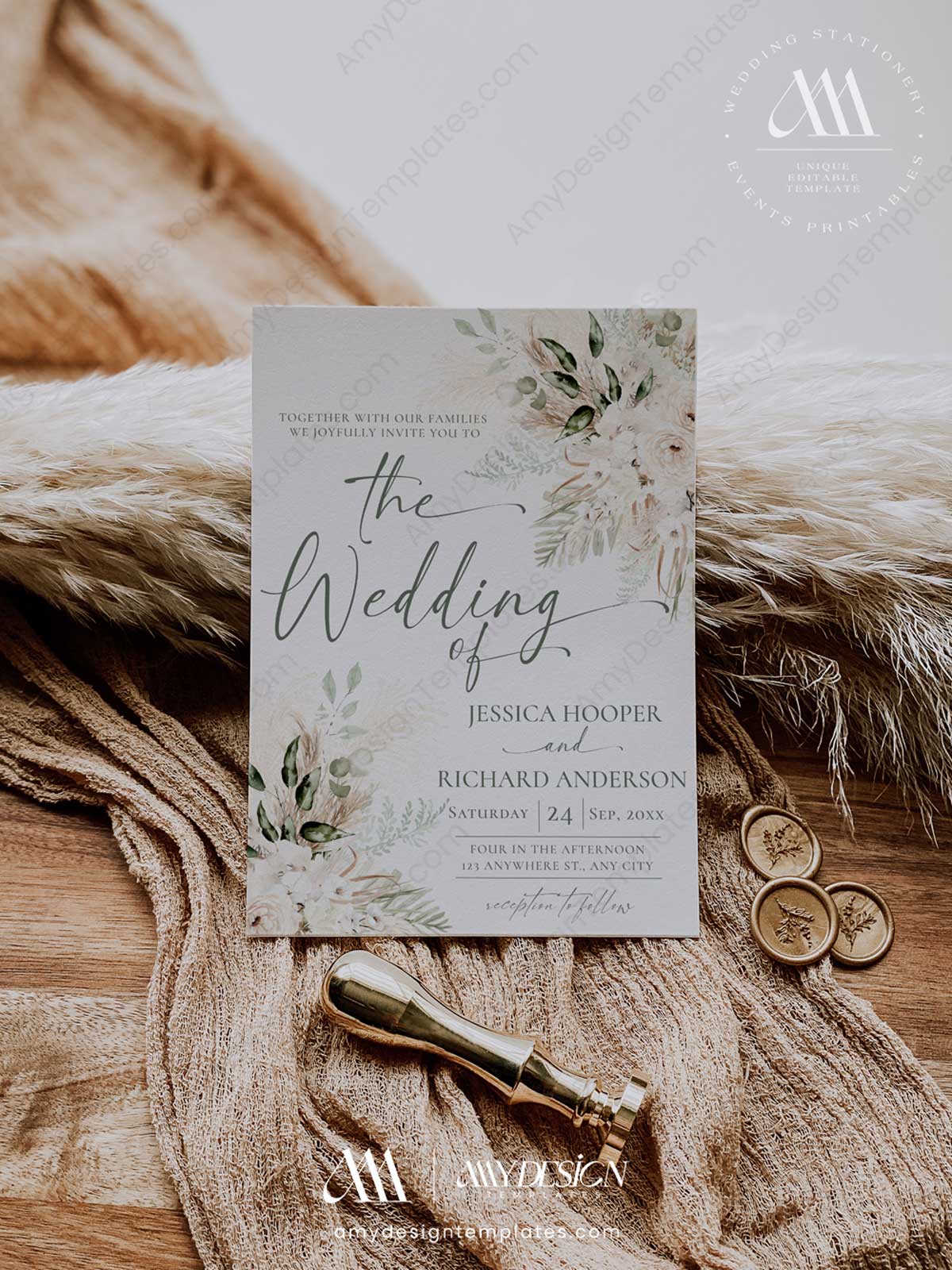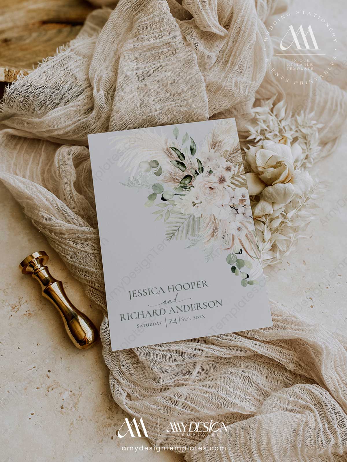 - A Sophisticated Greenery Palette: Immerse your guests in a calming harmony of earthy tones. The design is built on a foundation of sophisticated sage green, beautifully complemented by the soft textures of beige pampas grass and ivory florals. Subtle hints of warm rust and terracotta add a touch of depth, evoking a feeling of natural, effortless elegance.