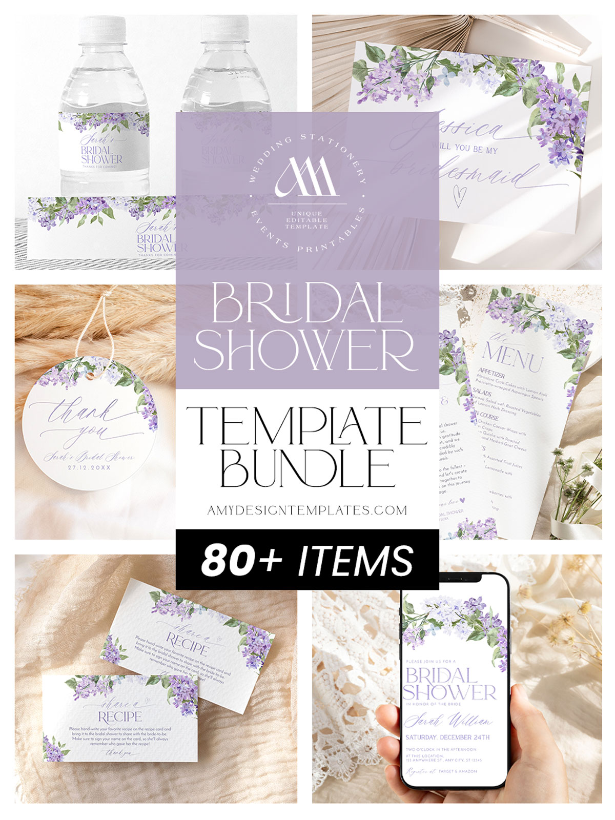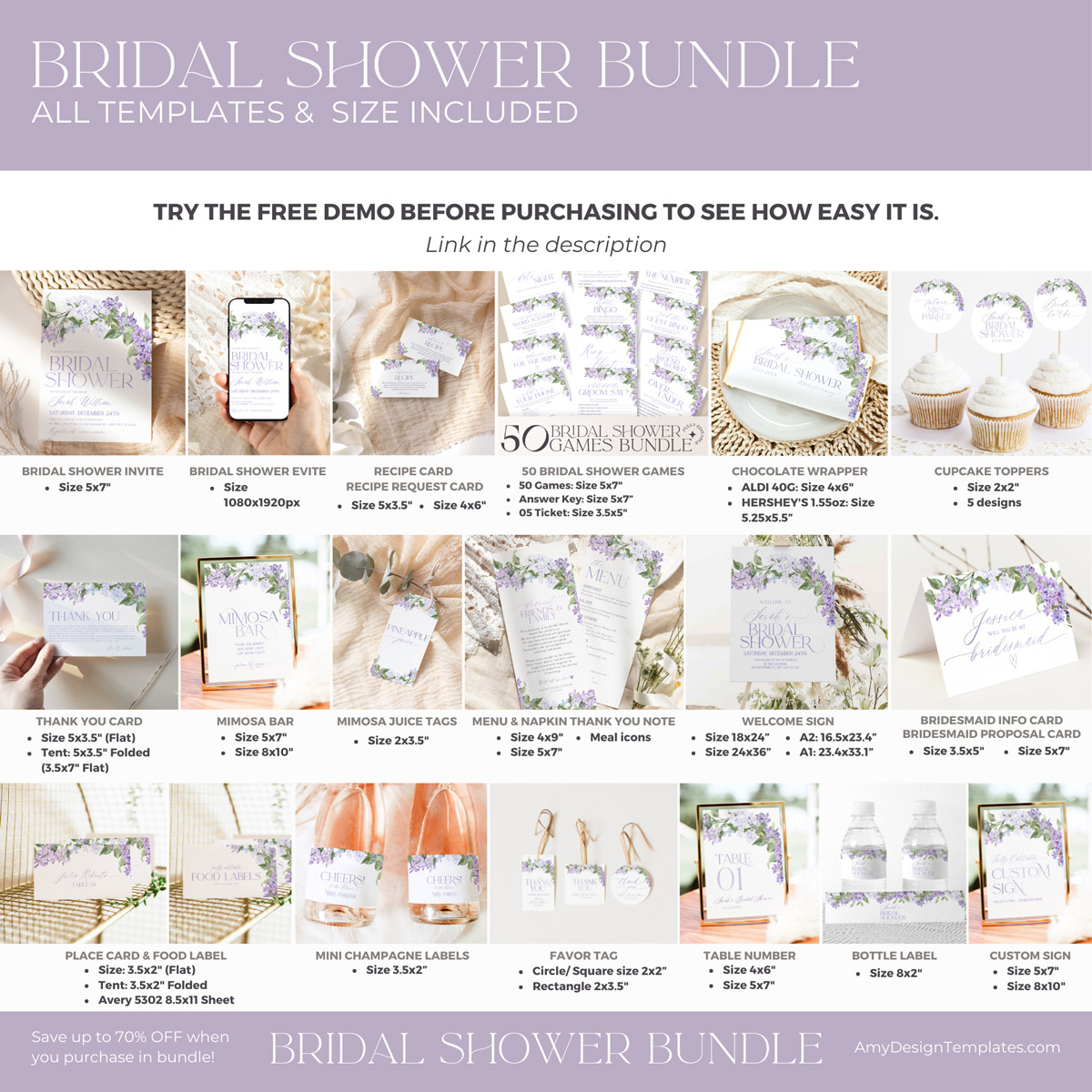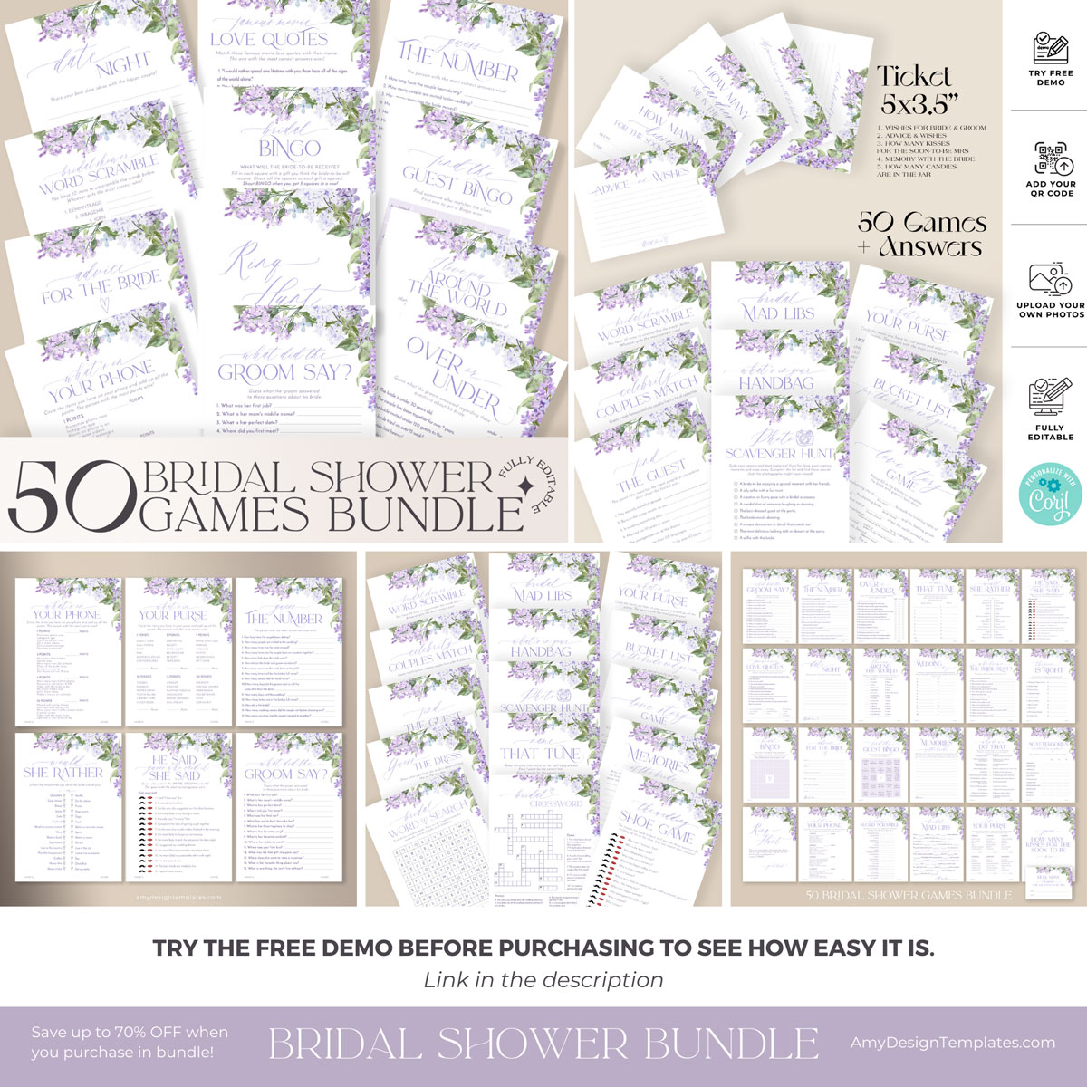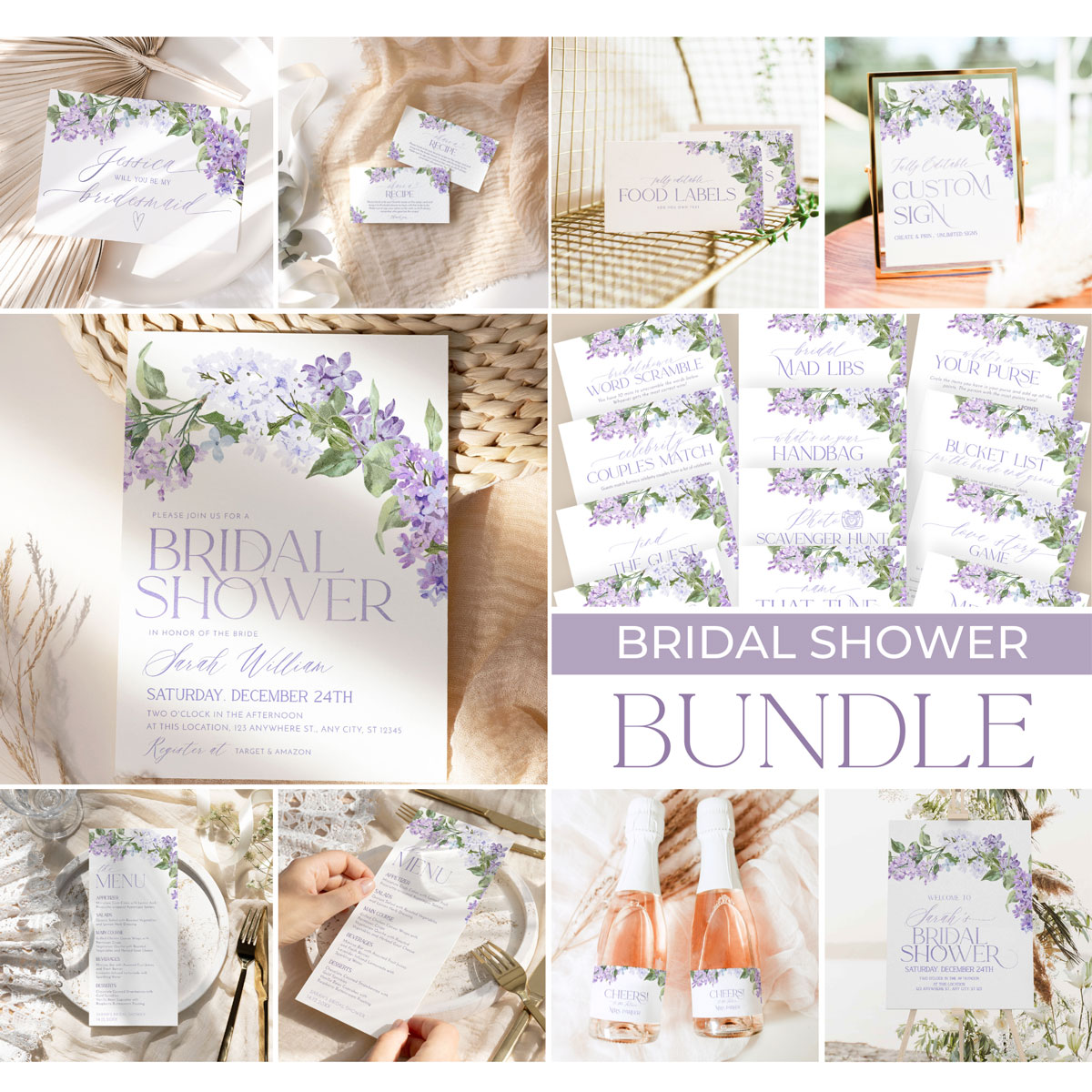 Lilac Bridal Shower Invitations Bundle Template | Purple Bridal Shower Bundles | 50 Printable Shower Games