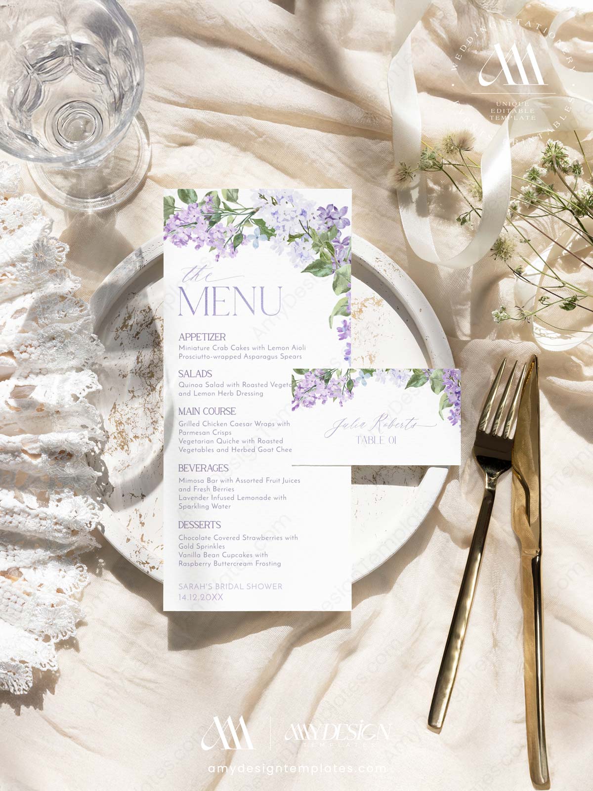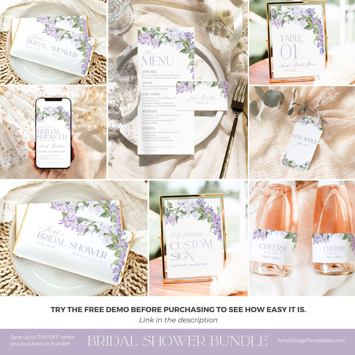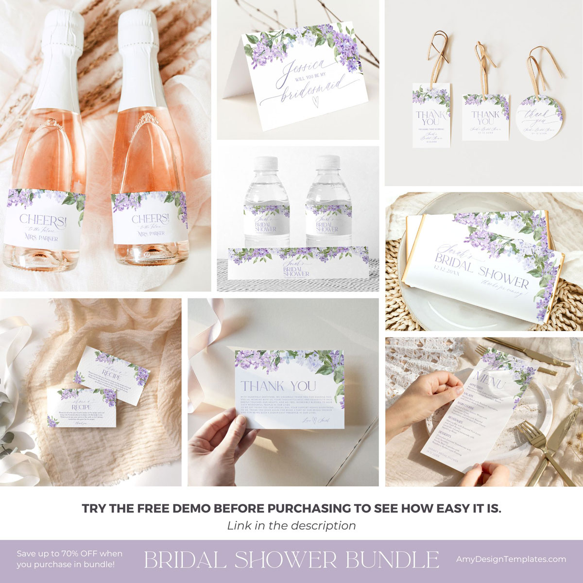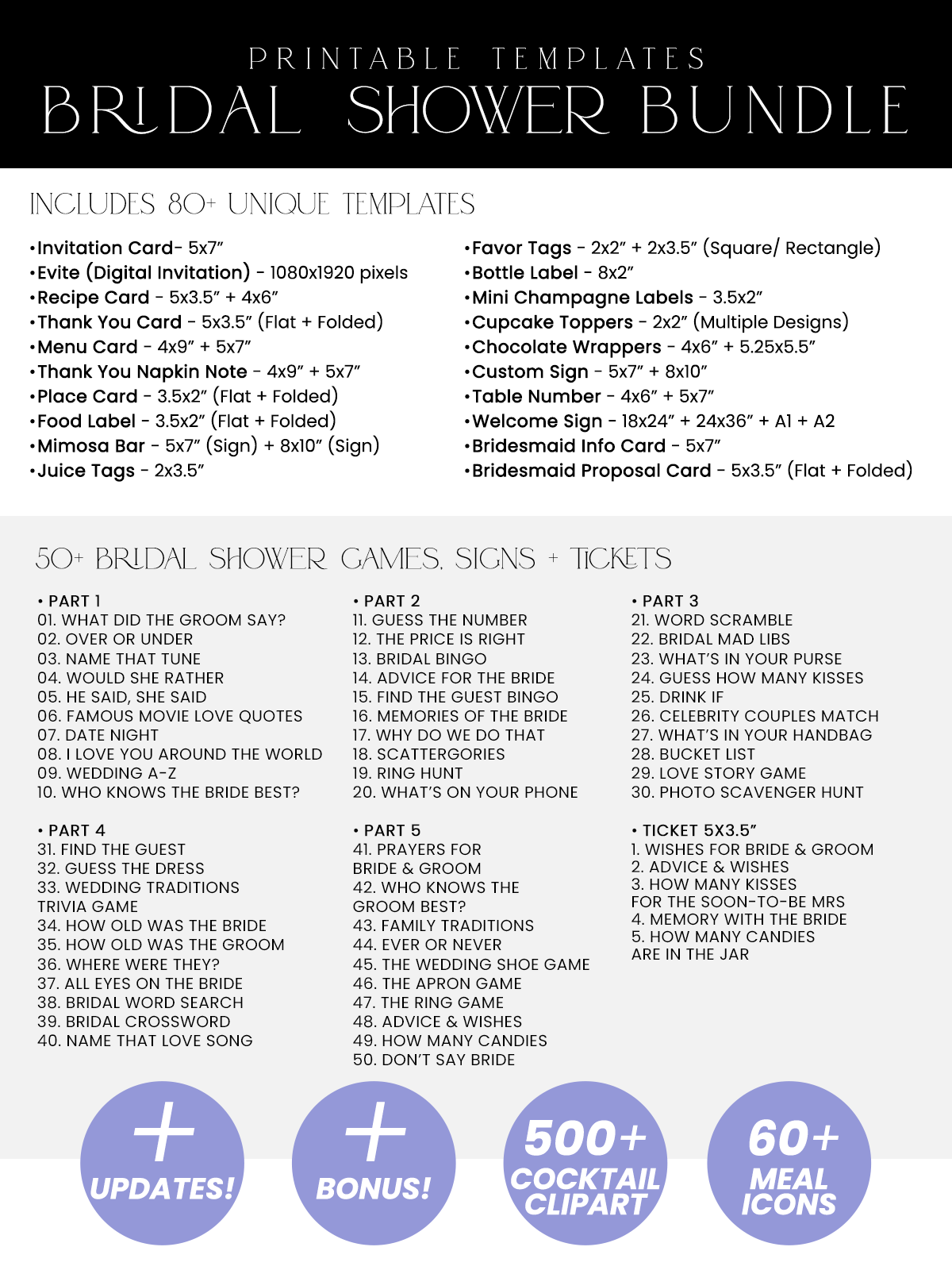 Lilac Bridal Shower Invitations Bundle Template | Purple Bridal Shower Bundles | 50 Printable Shower Games