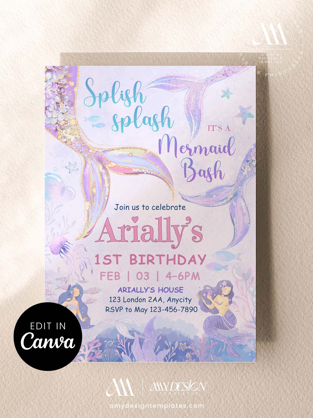 Little Mermaid Bash Invitation Birthday Party Template Printable | Splish Splash Mermaid Invite Editable