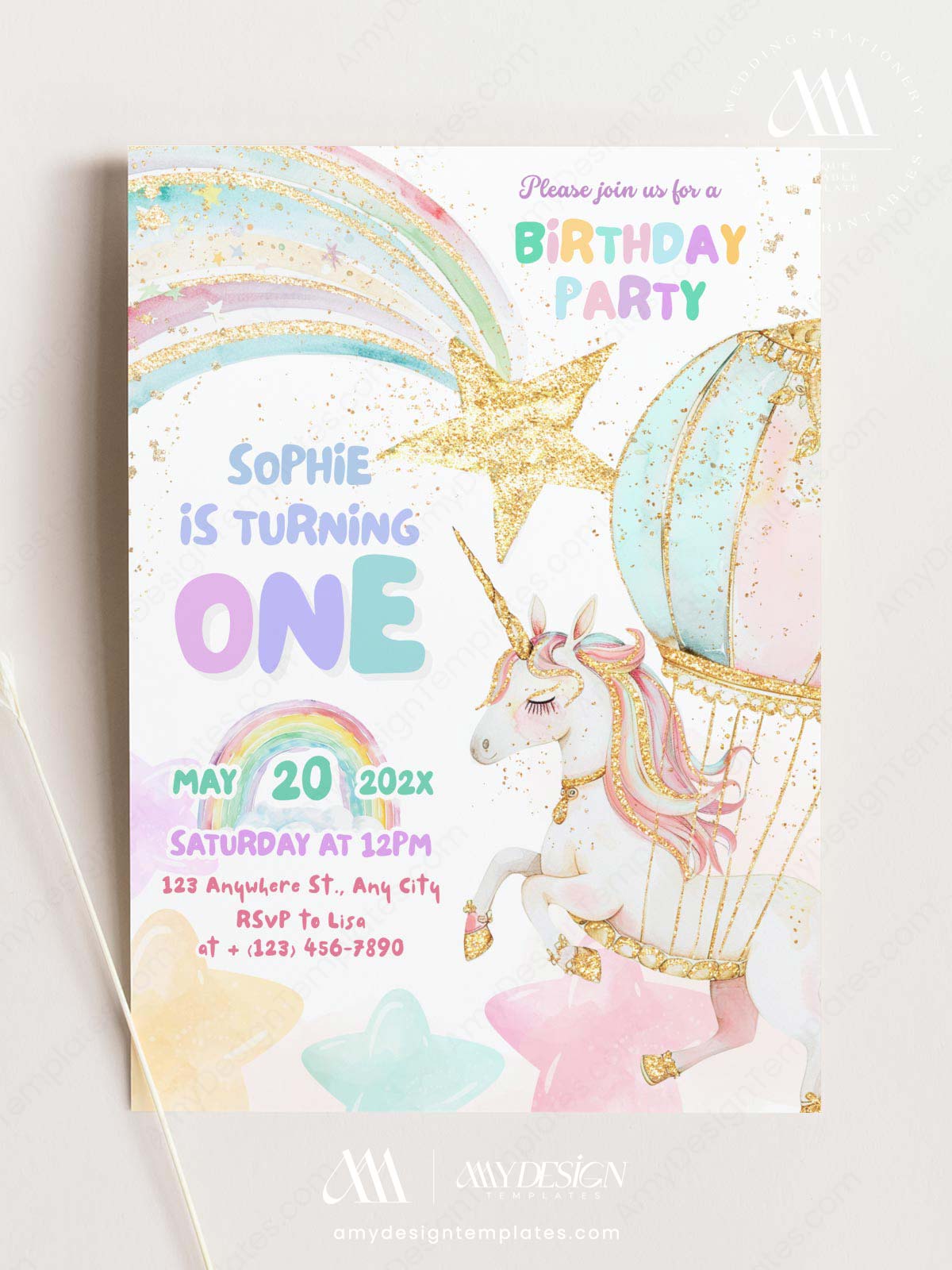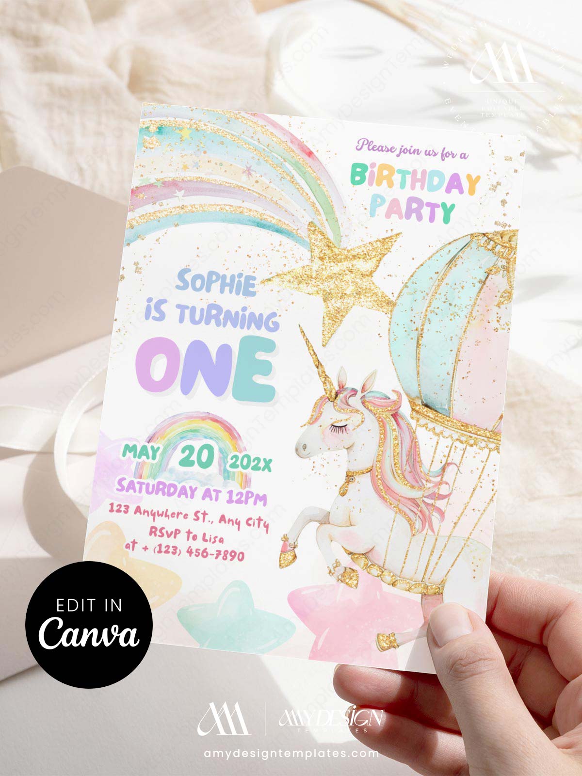 Magical Girls Party Unicorn Birthday Invitation Template Canva | Hot Air Balloon Birthday Invite