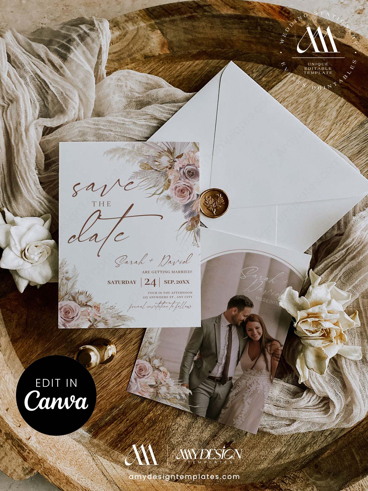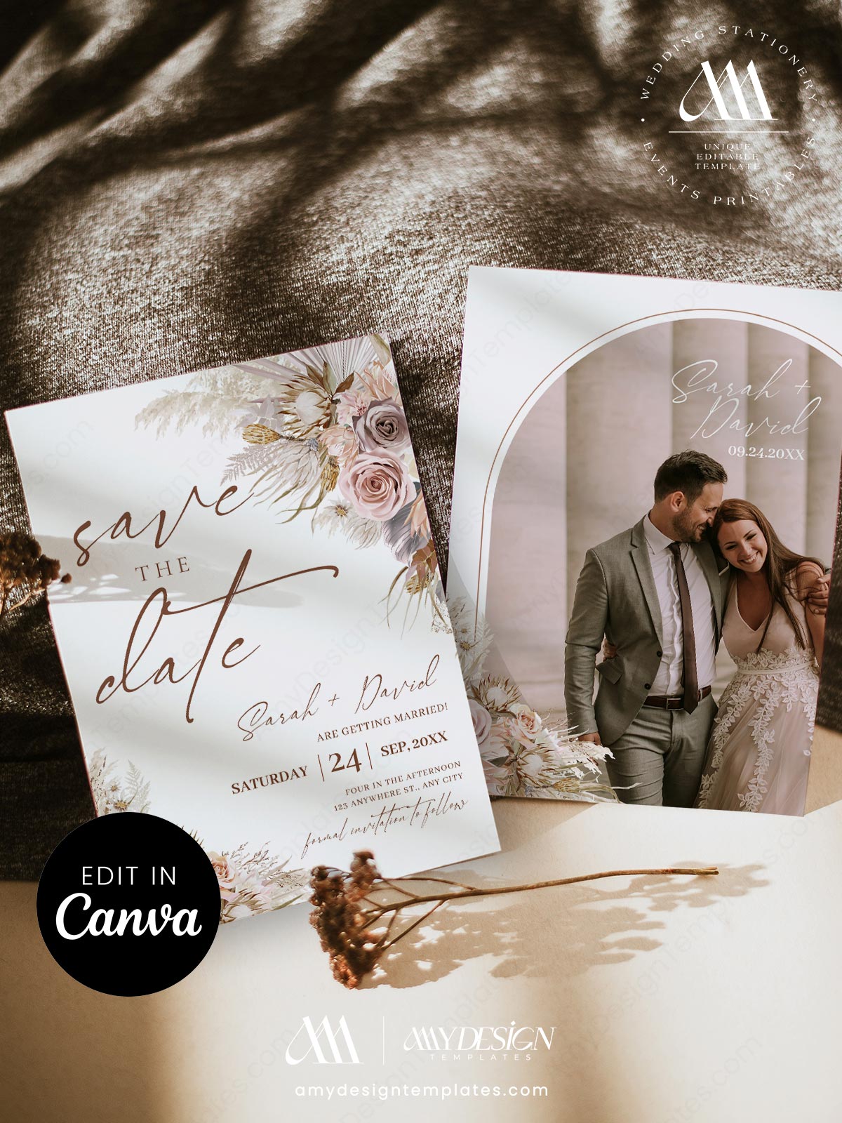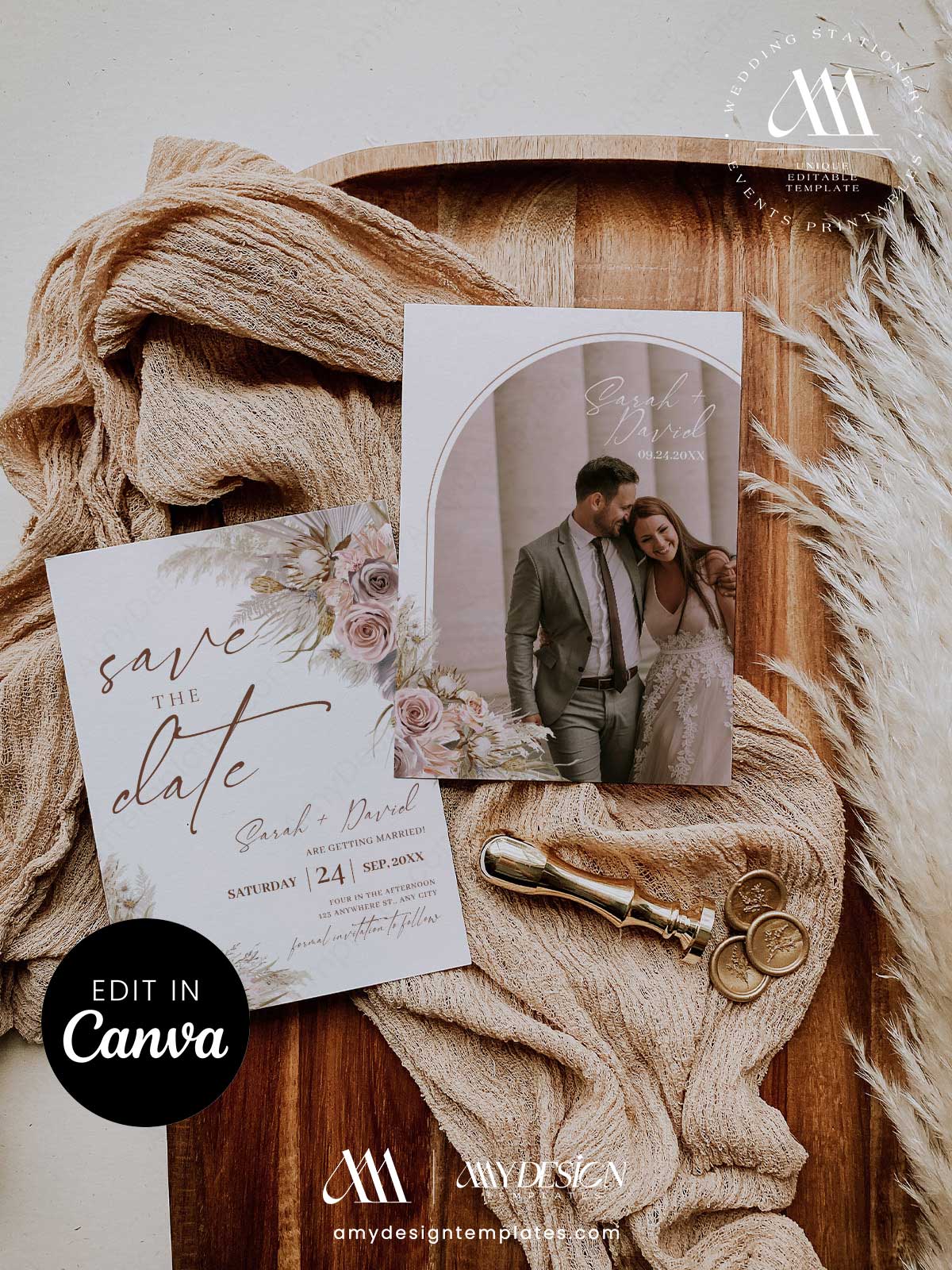 The stationery combines airy watercolor illustrations of pampas grass and soft mauve roses with a modern photo card that uses a subtle arched frame to highlight the couple’s image.