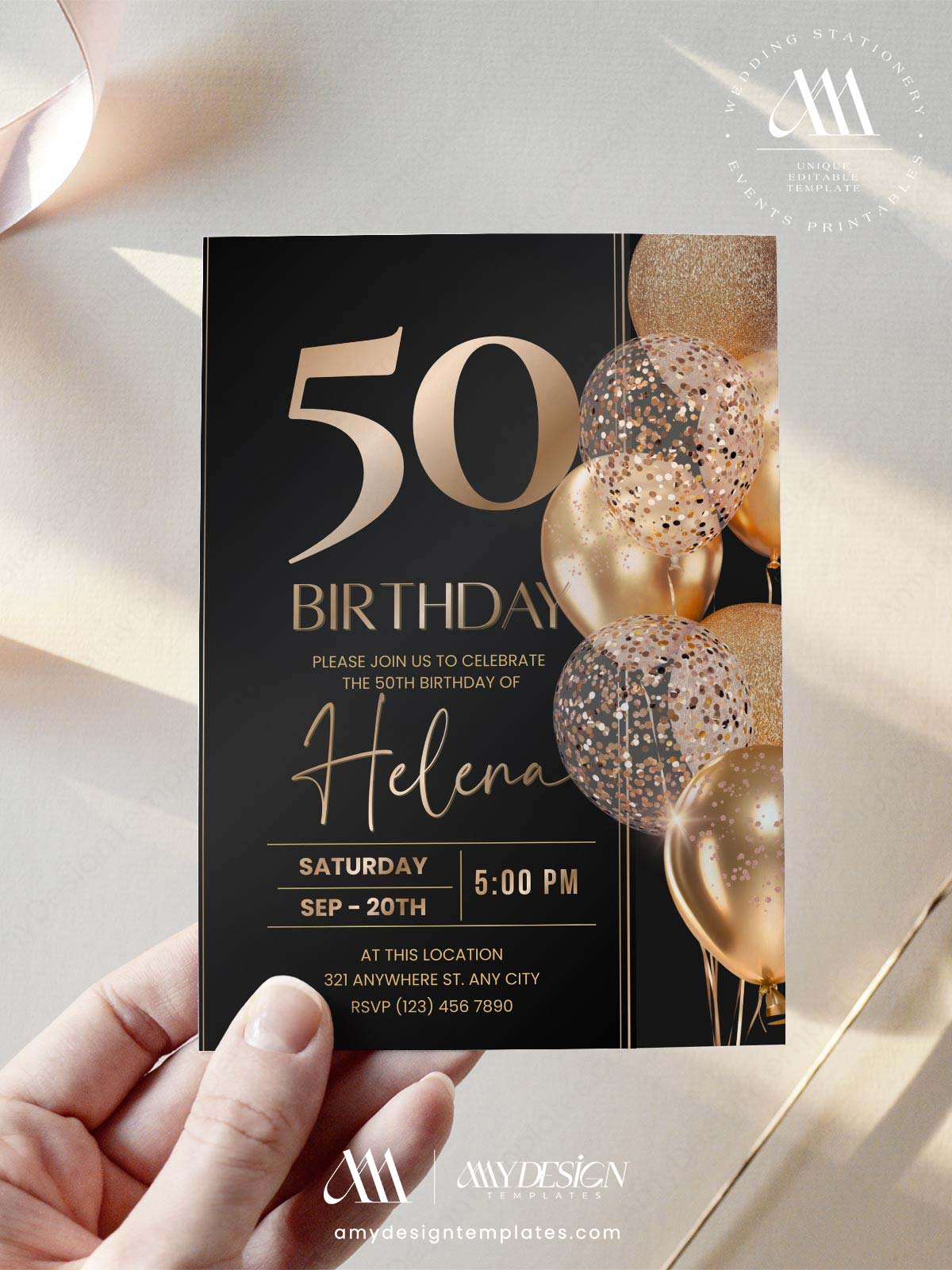Minimalist Black Gold 30th 40th 50th Birthday Invitation | Elegant Any Age Birthday Card | Editable Canva Template