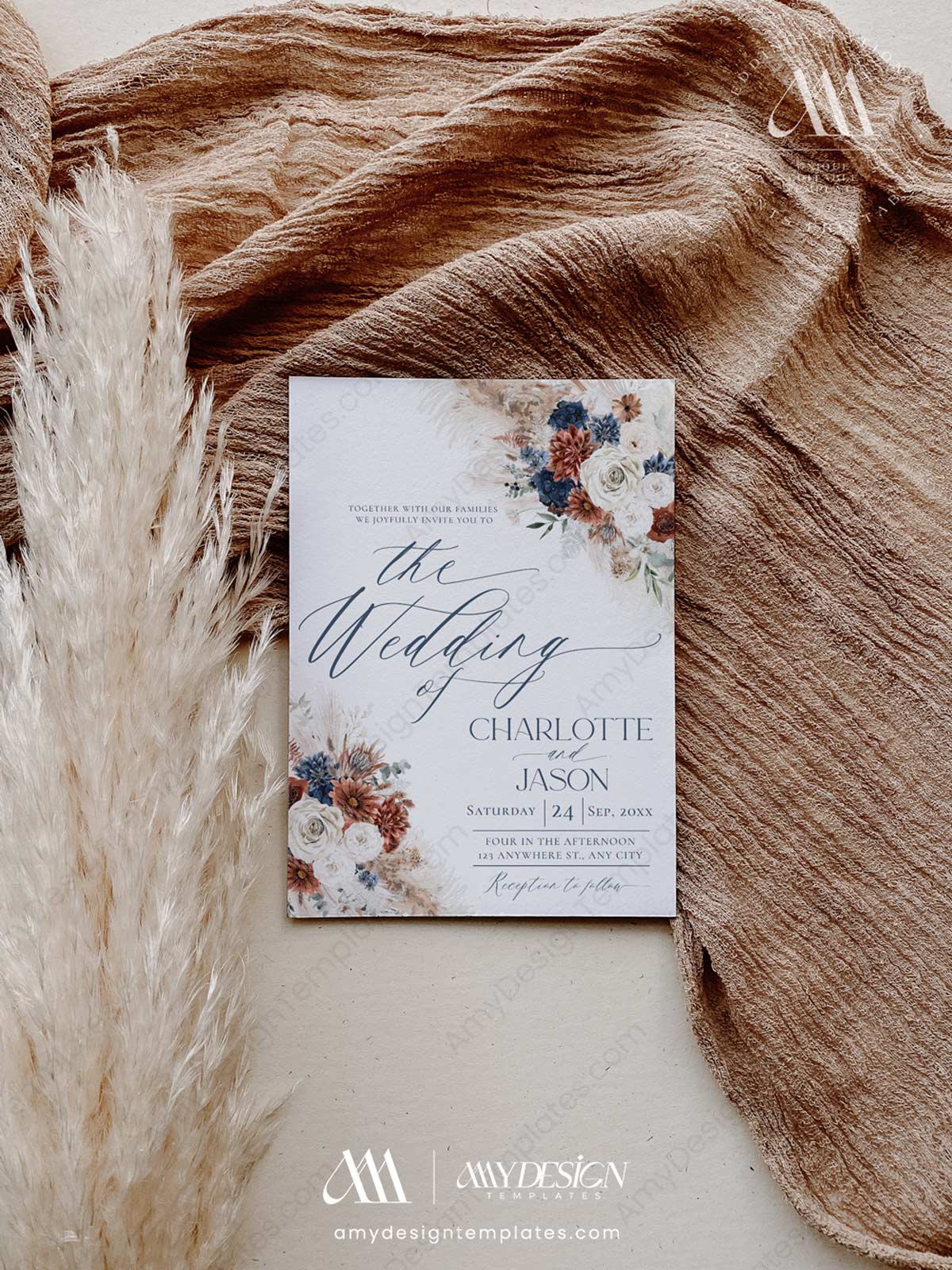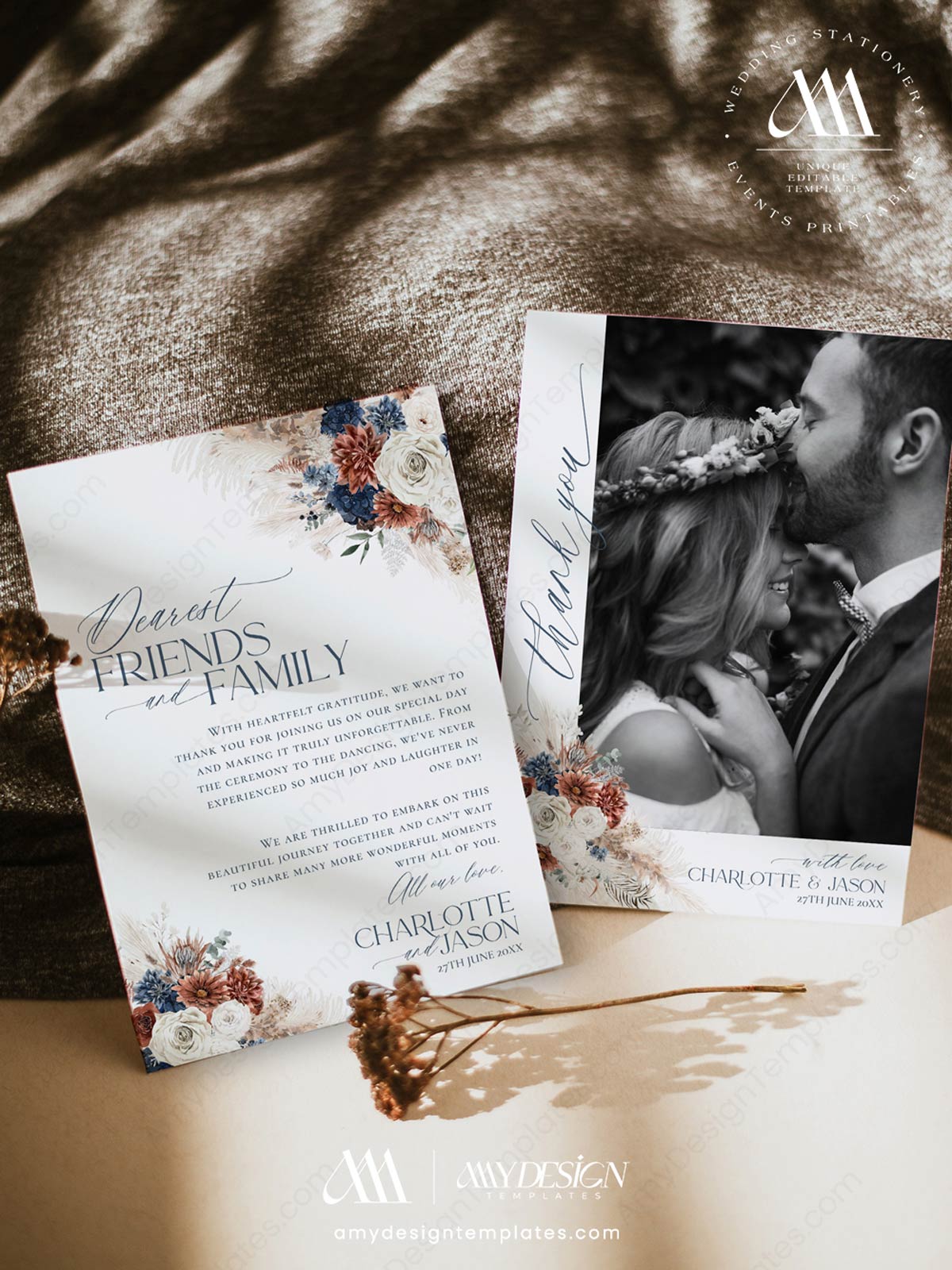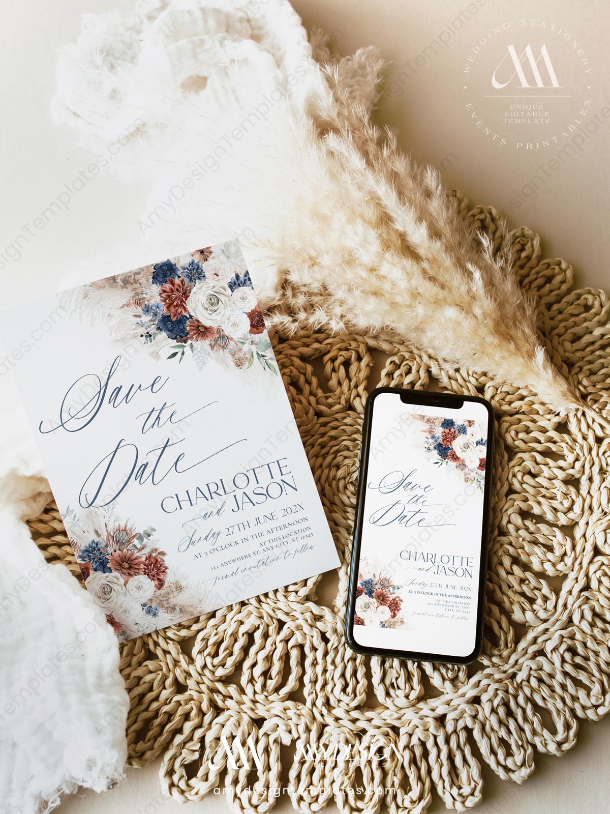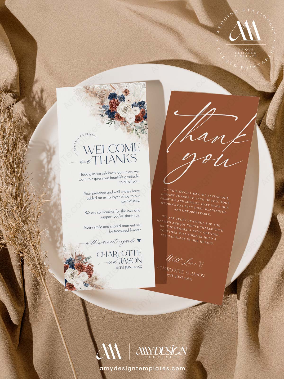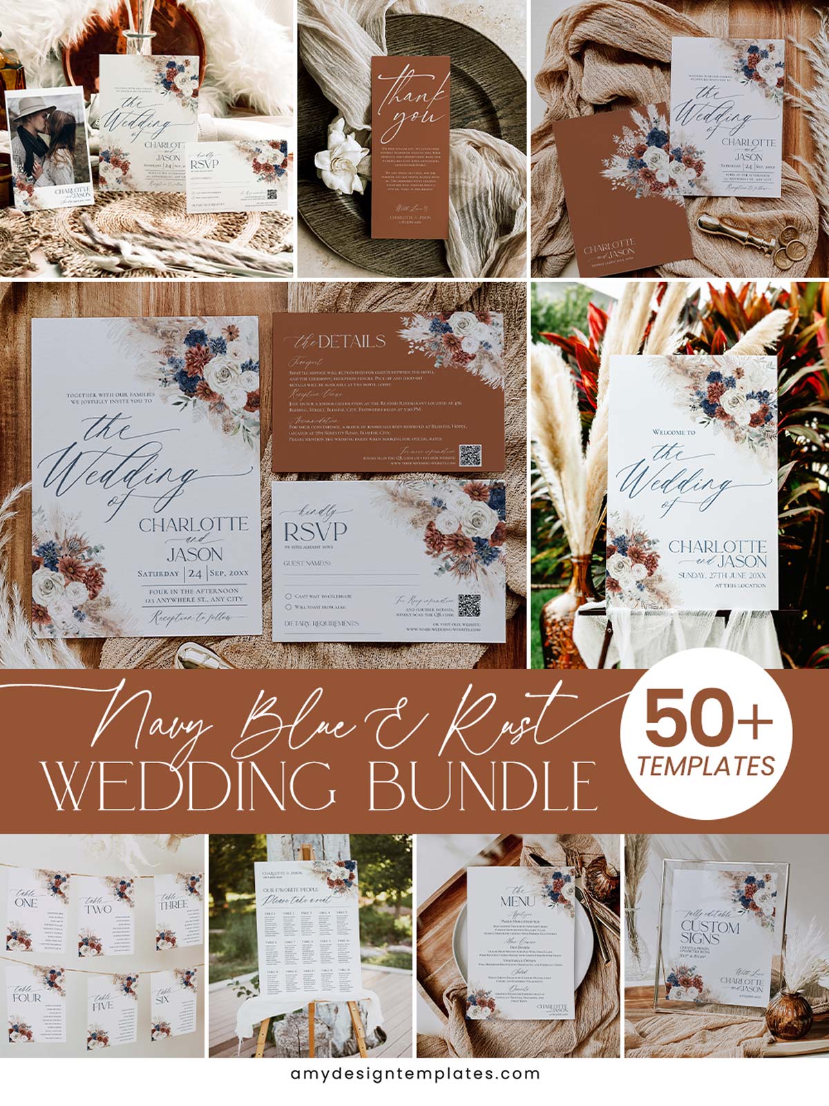 Make a striking statement with our Navy Blue & Rust Wedding Template BUNDLE. Perfectly curated for autumn weddings, winter celebrations, or modern boho events, this collection pairs deep, dramatic tones with soft, rustic textures.