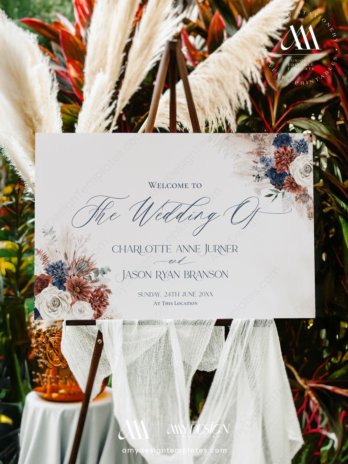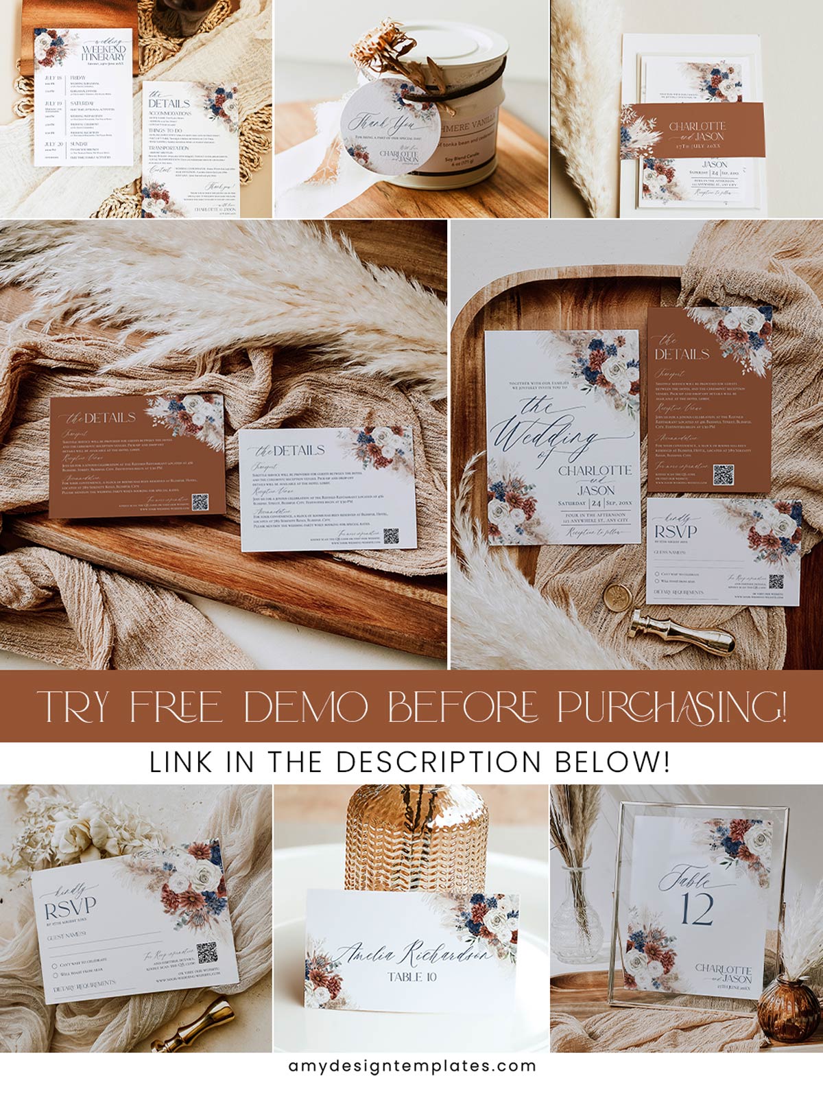 Unlock the full potential of your wedding theme with our comprehensive Navy Blue & Rust Wedding Template BUNDLE. Designed as an All-in-One Fall Boho Solution, this collection provides a seamless array of Invitations & Signs to cover every aspect of your big day.