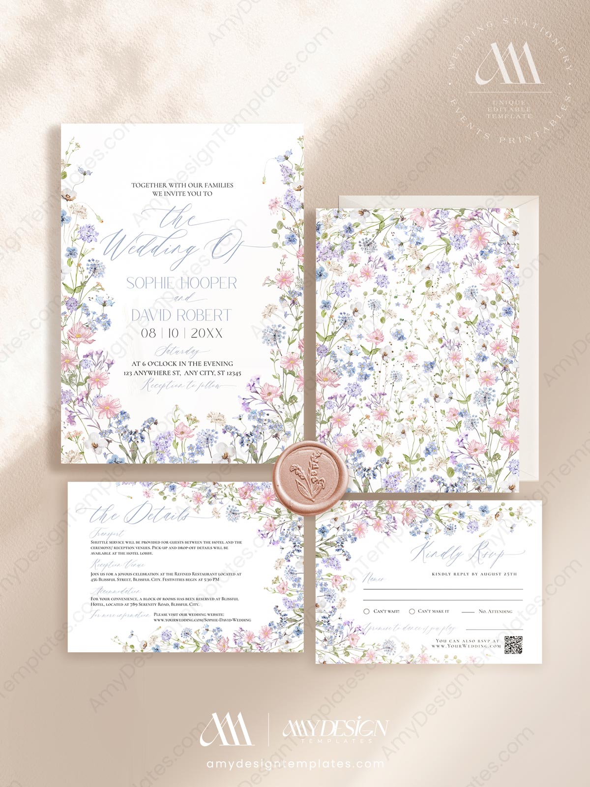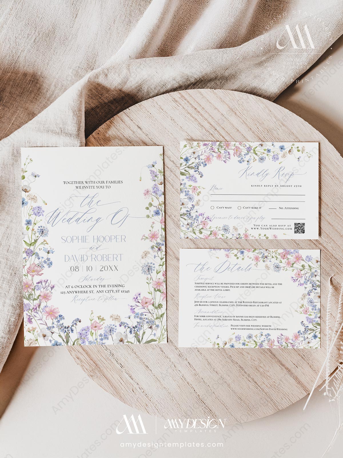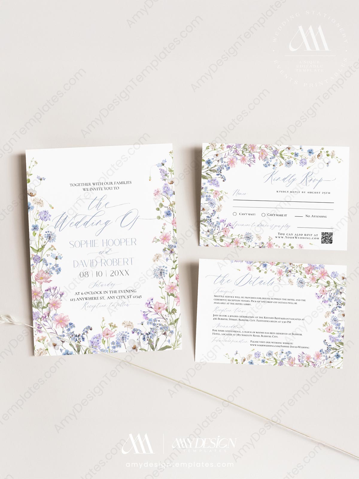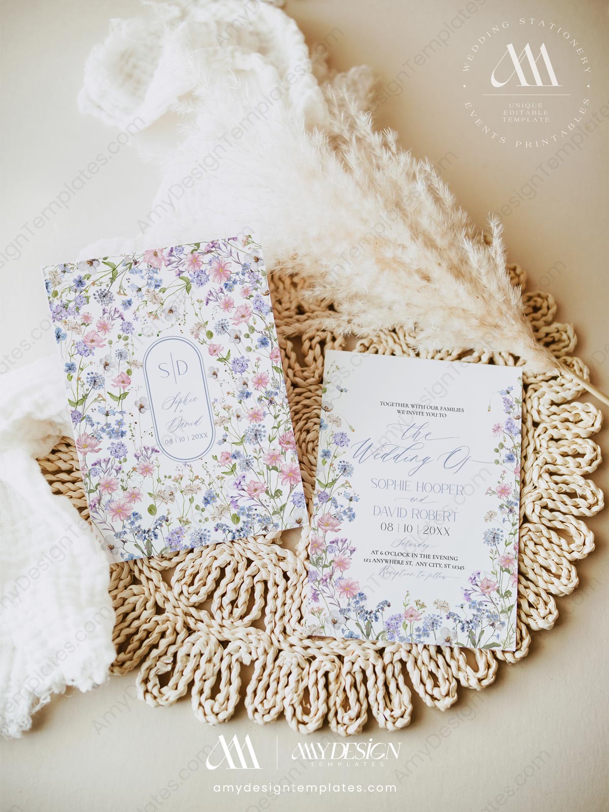 Pastel Wildflower Wedding Invitation Set Templates | Floral Wedding Card | Baby Pink Baby Blue