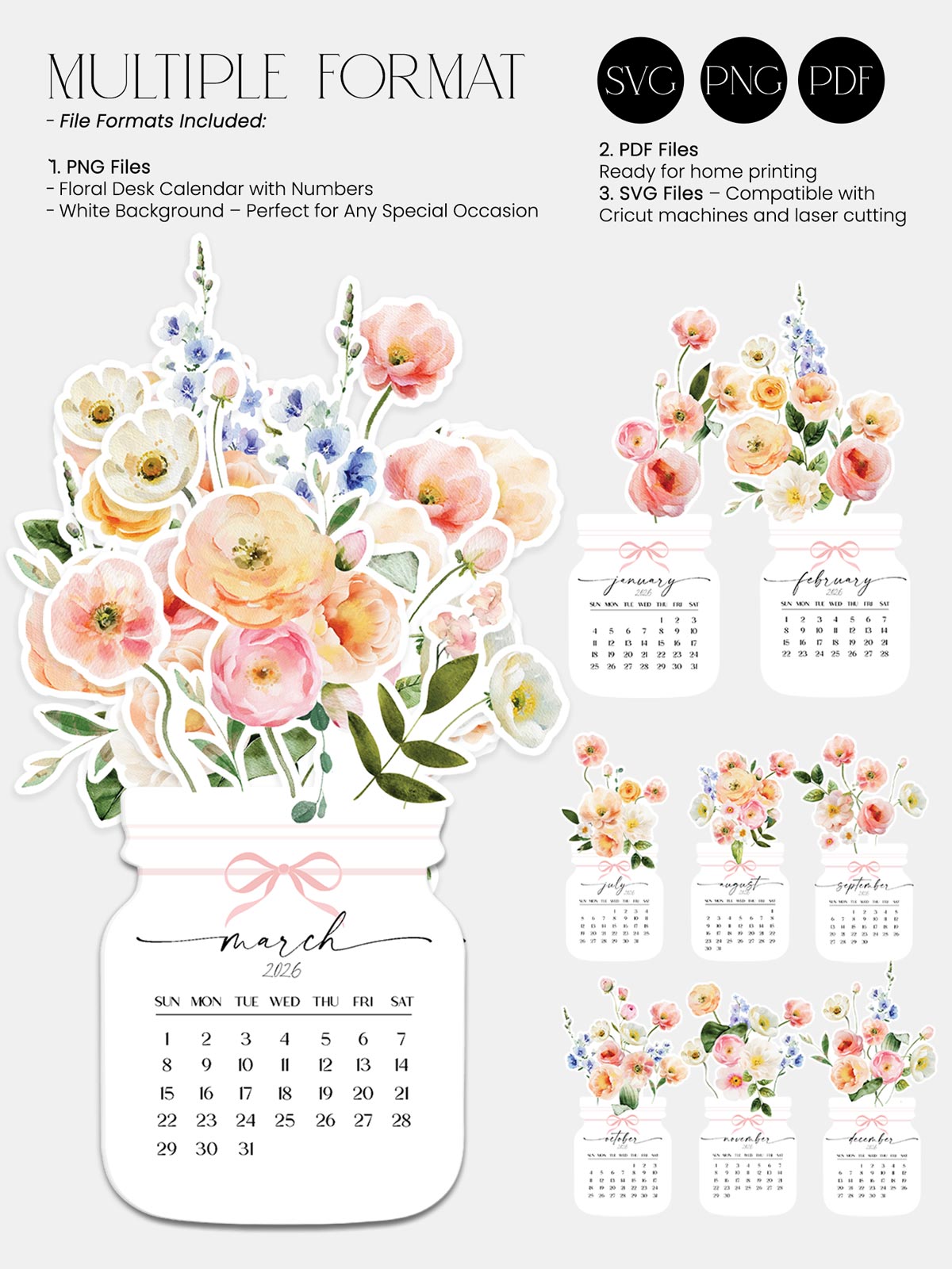 Printable 2026 Floral Desk Calendar Digital Download | Watercolor Spring Bloom (SVG, PNG, PDF)