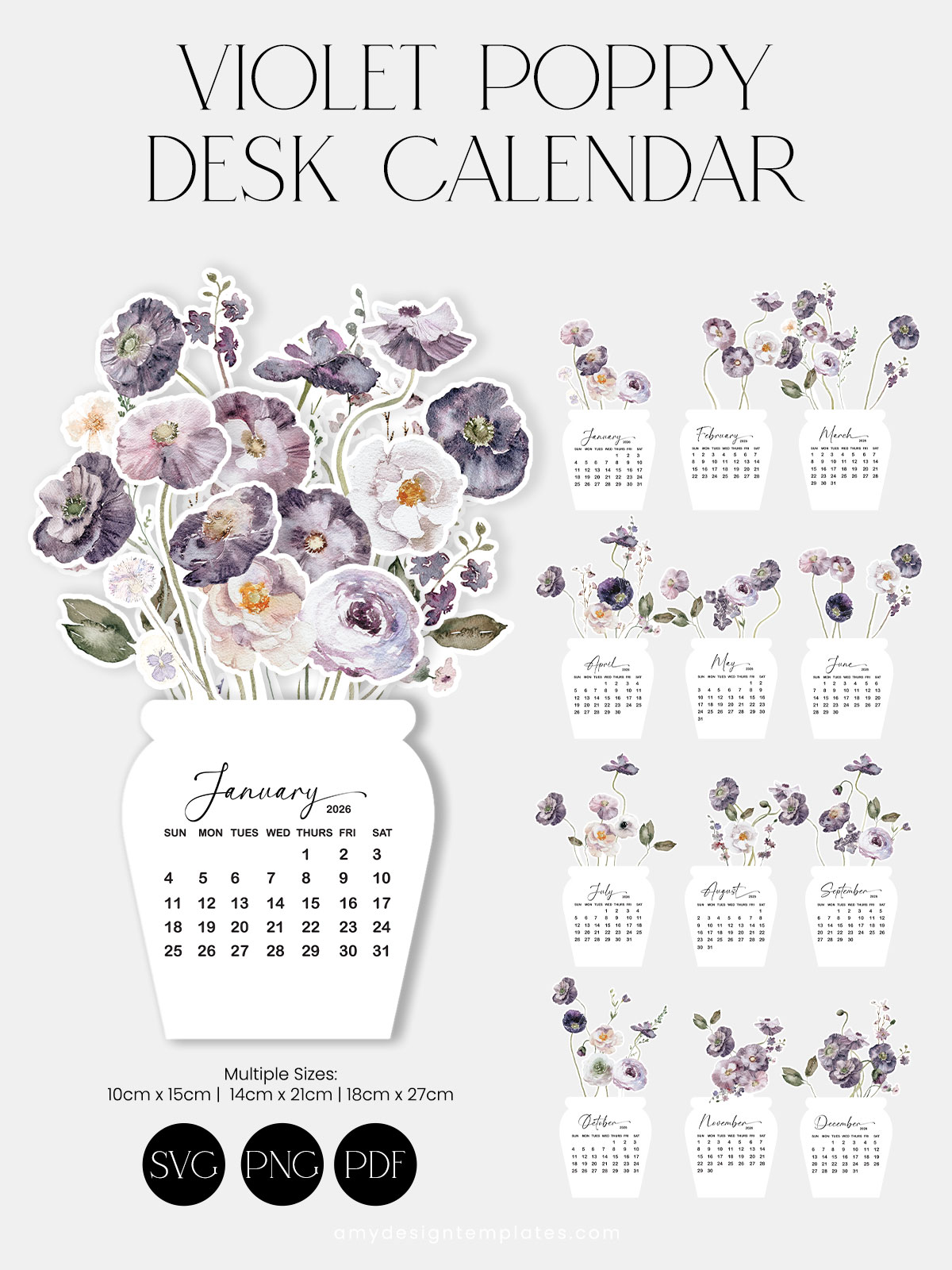This digital download offers a collection of stunning, printable pages featuring exquisite, watercolor-style purple floral and violet poppy vase designs for every month. It’s the perfect, stylish solution for a compact Mini Calendar 2026 that brightens your home or office.