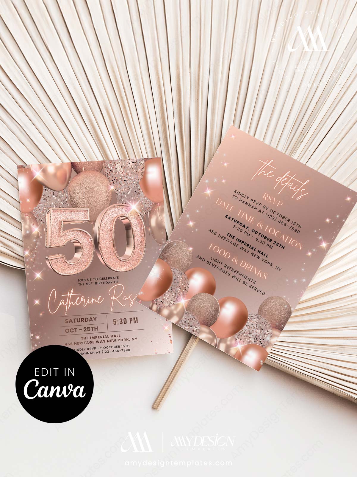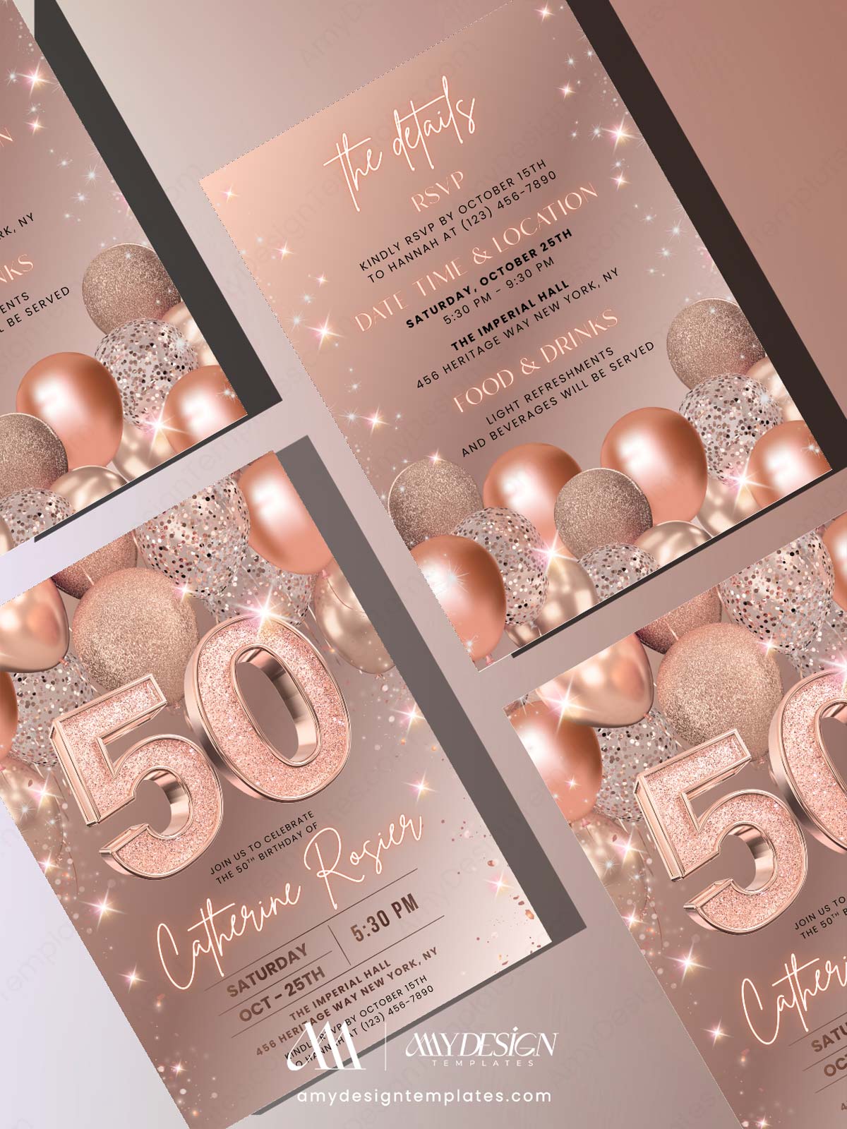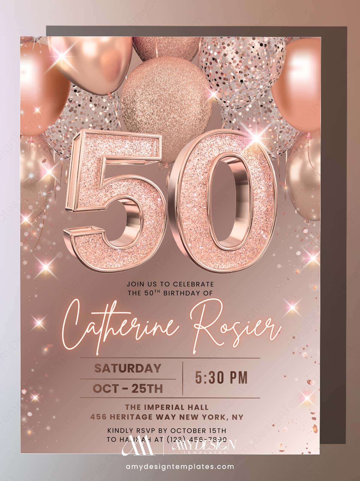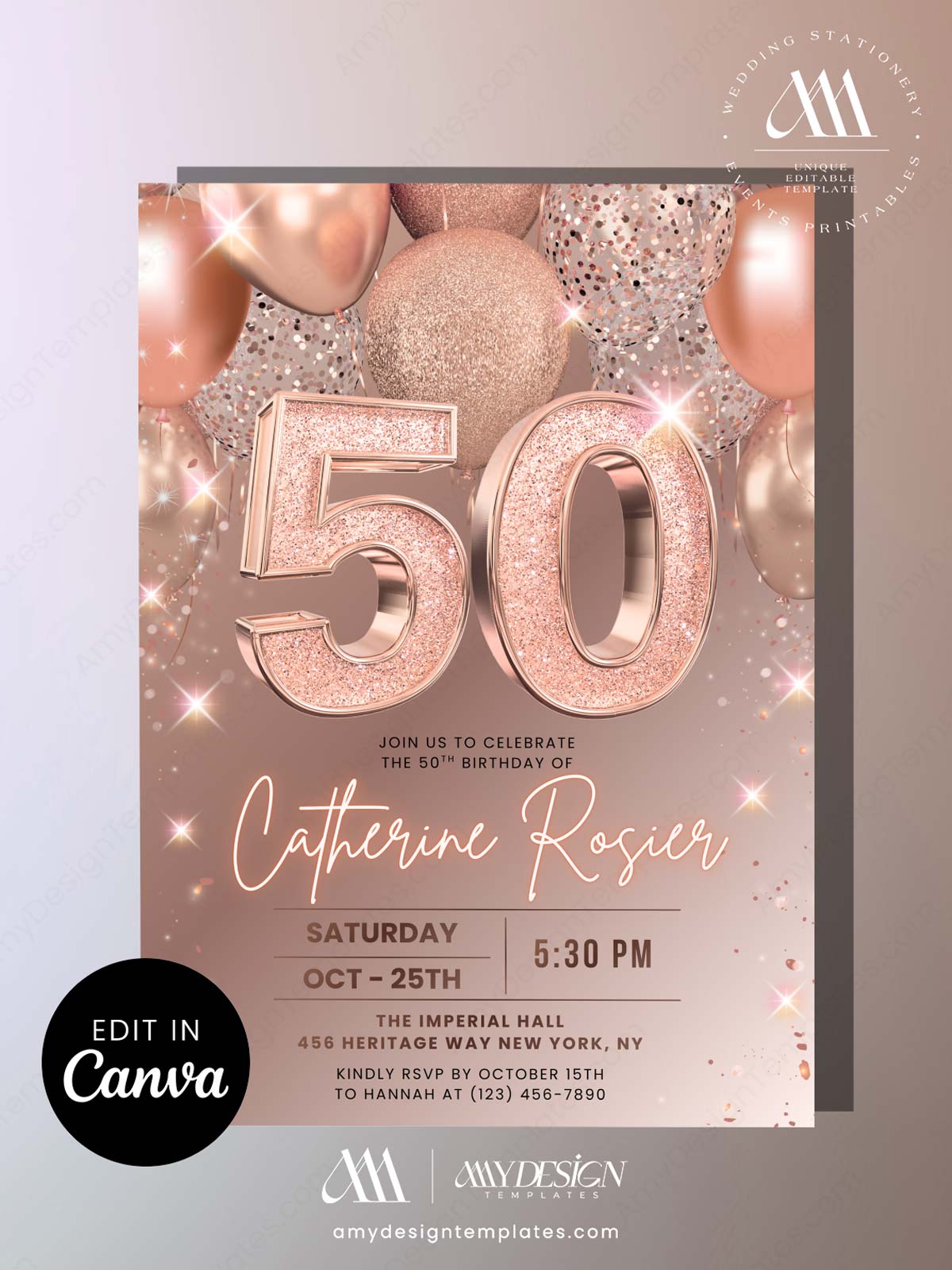 Diamonds and Rose Gold for your big milestone with Sparkling Rose Gold 30th 40th 50th Birthday Invitation, features shimmering 3D rose gold balloons and diamond-effect numbers for a truly elegant look. Easily edit the age for any milestone birthday using Canva. Instant digital download, ready for high-quality printing or sharing online.