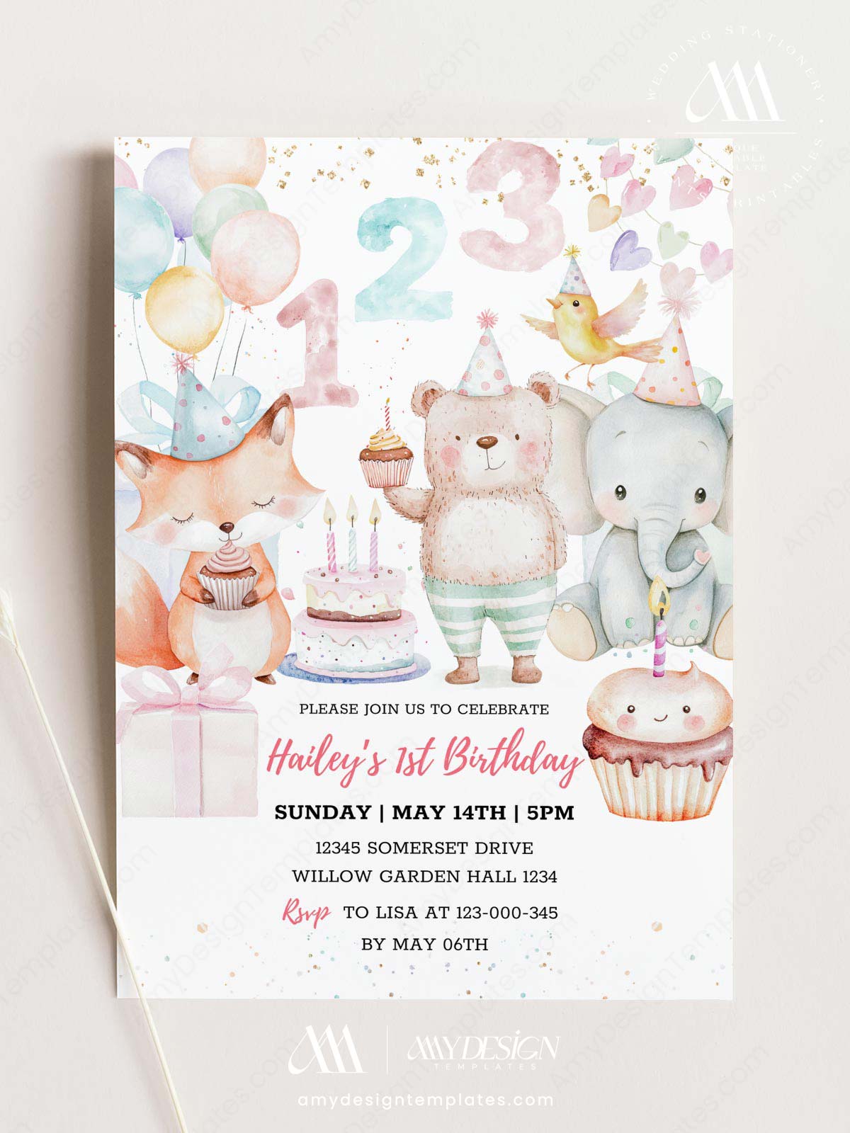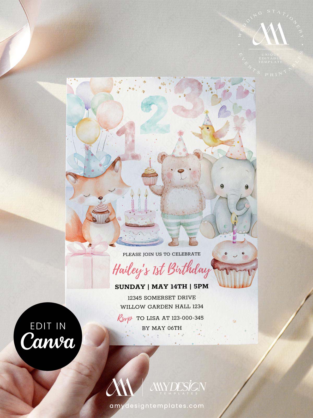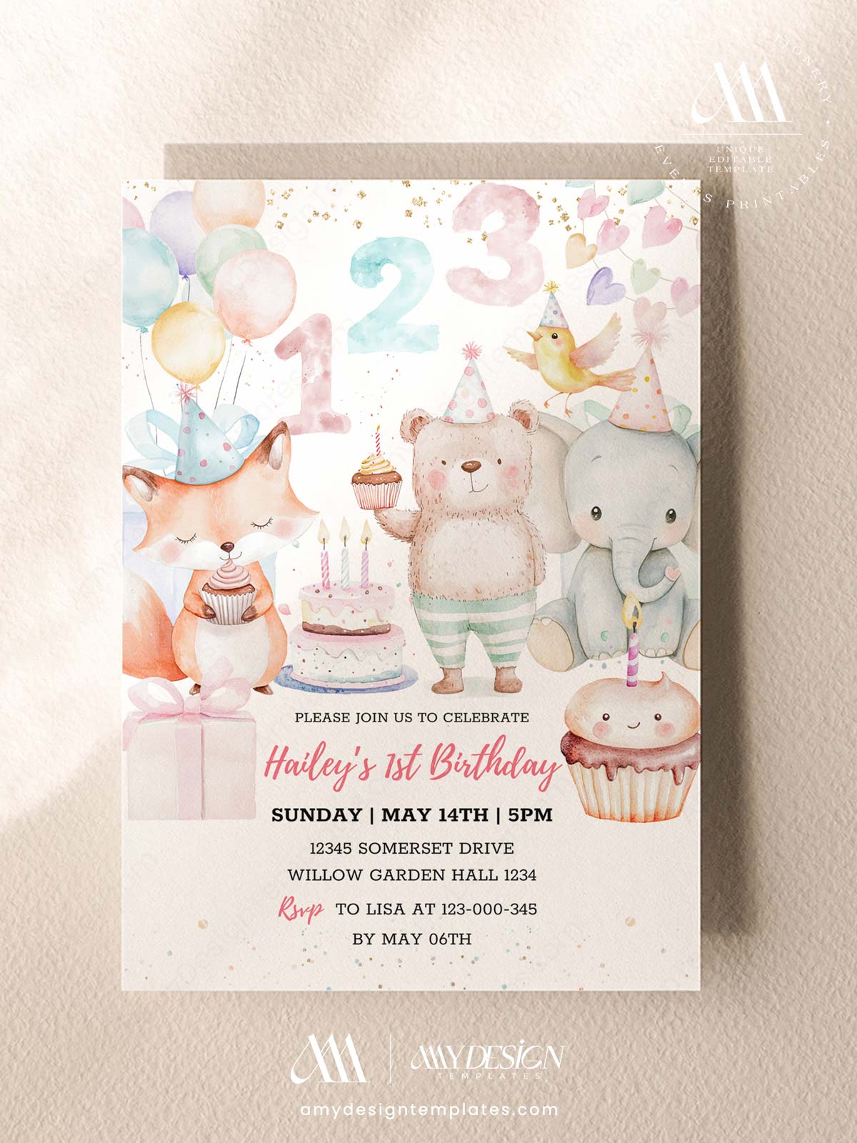 Ready to customize on Canva in just a few minutes with the Sweet One 1st Birthday Invitation Card Template. This is a premium digital paperie featuring a bear, fox, and elephant with festive treats. Update party details and colors instantly!