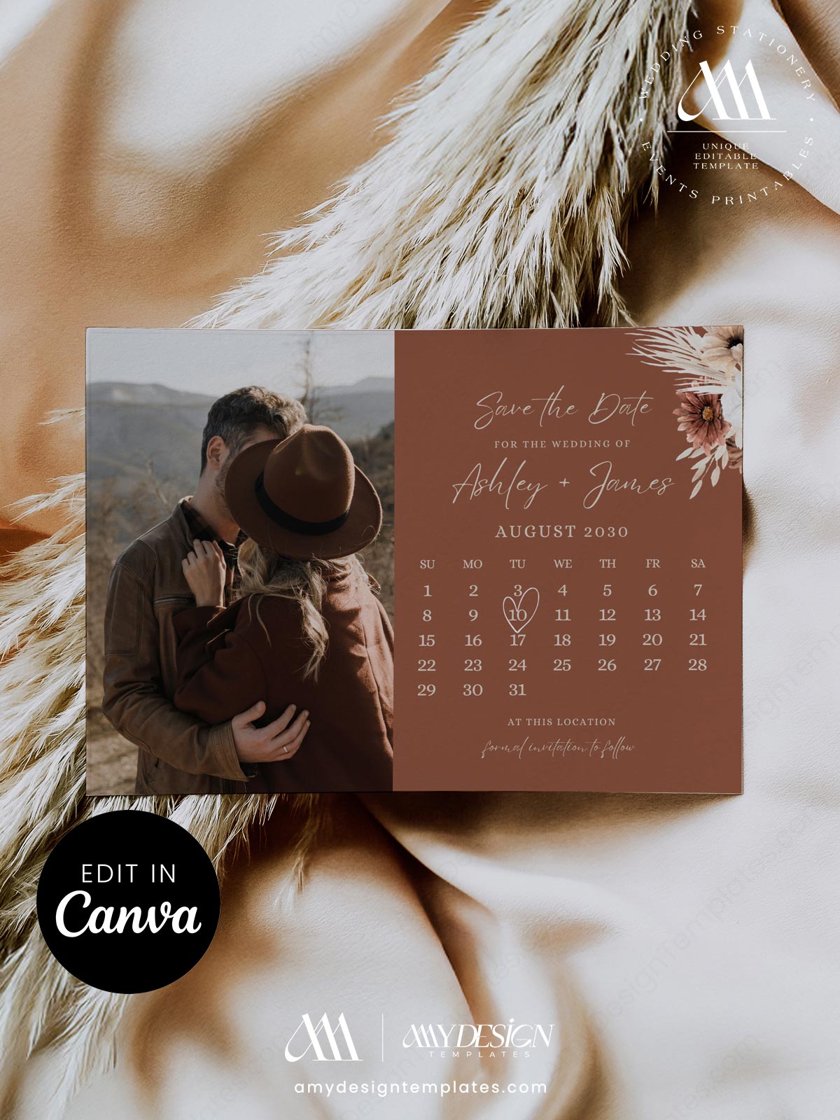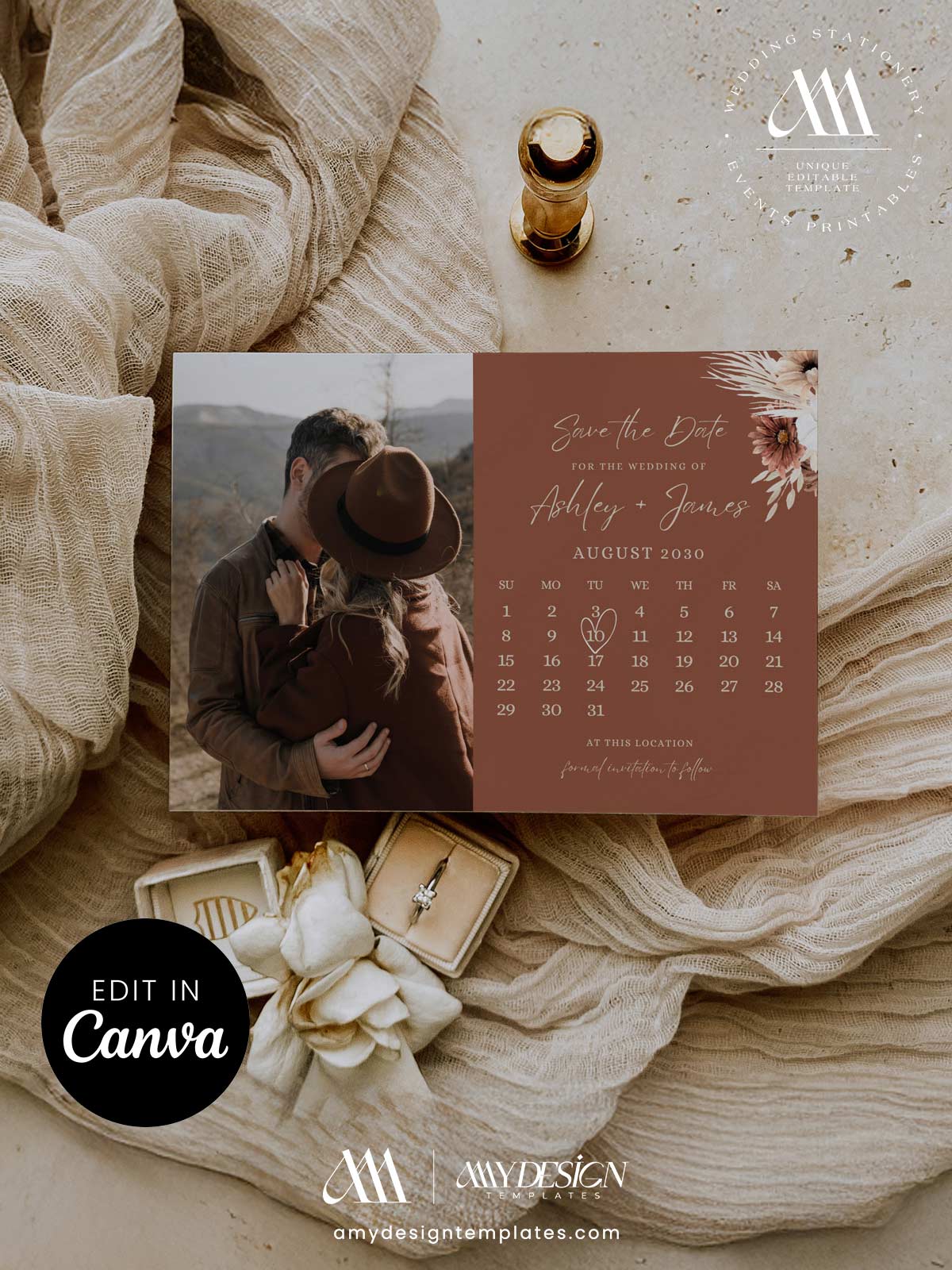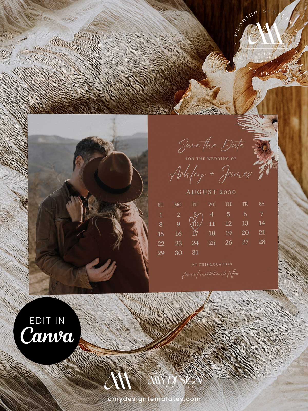 Terracotta Calendar Save the Date Wedding Photo Template | Rust Burnt Orange Canva Editable