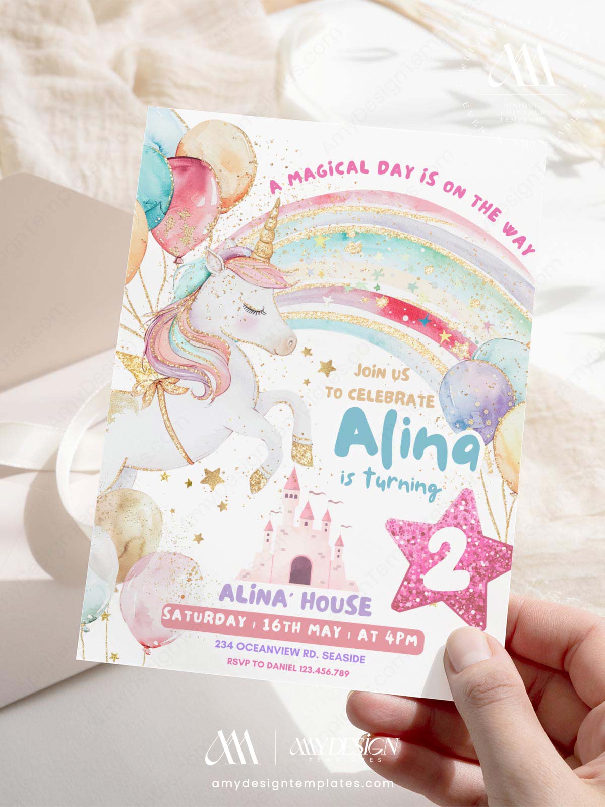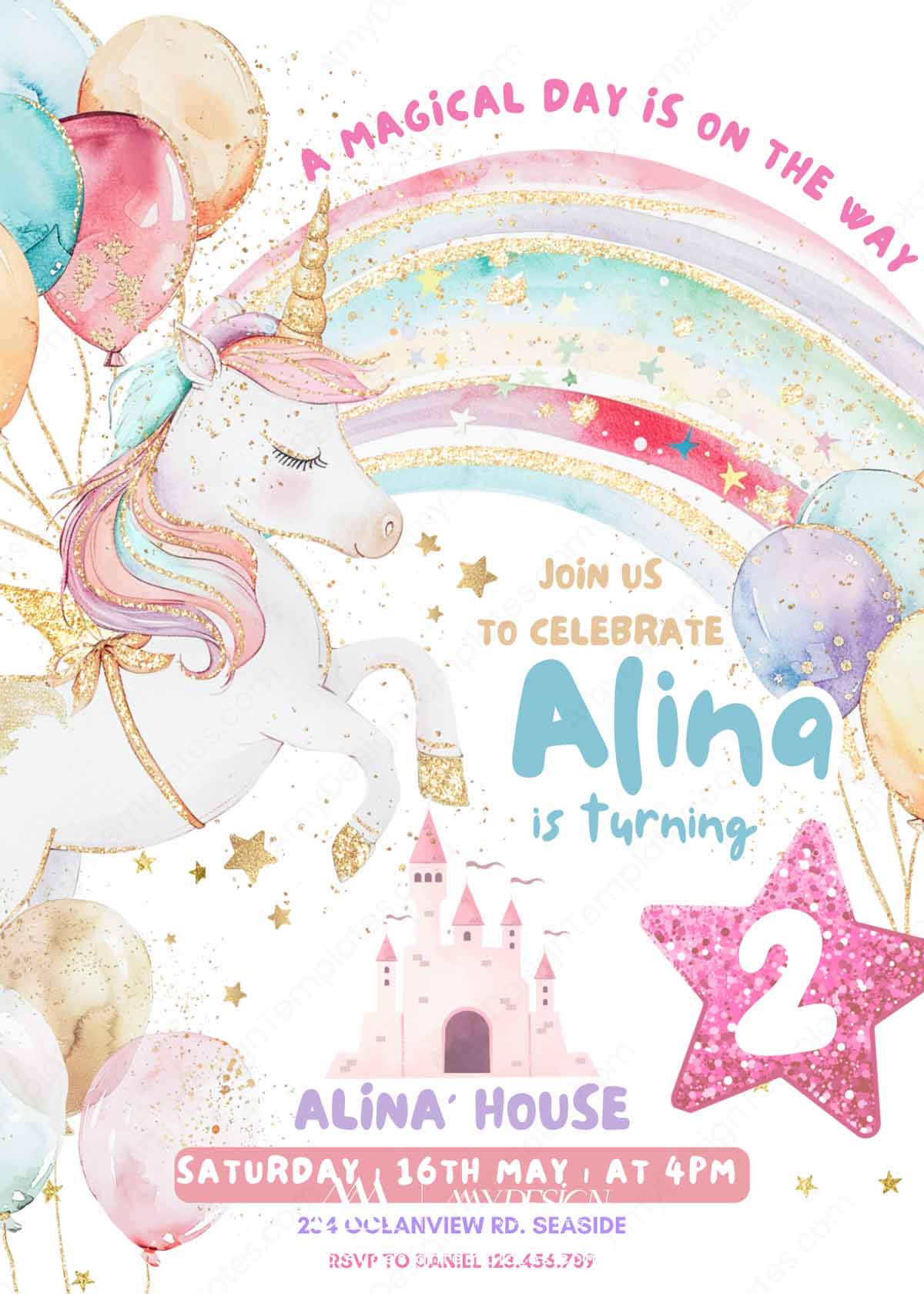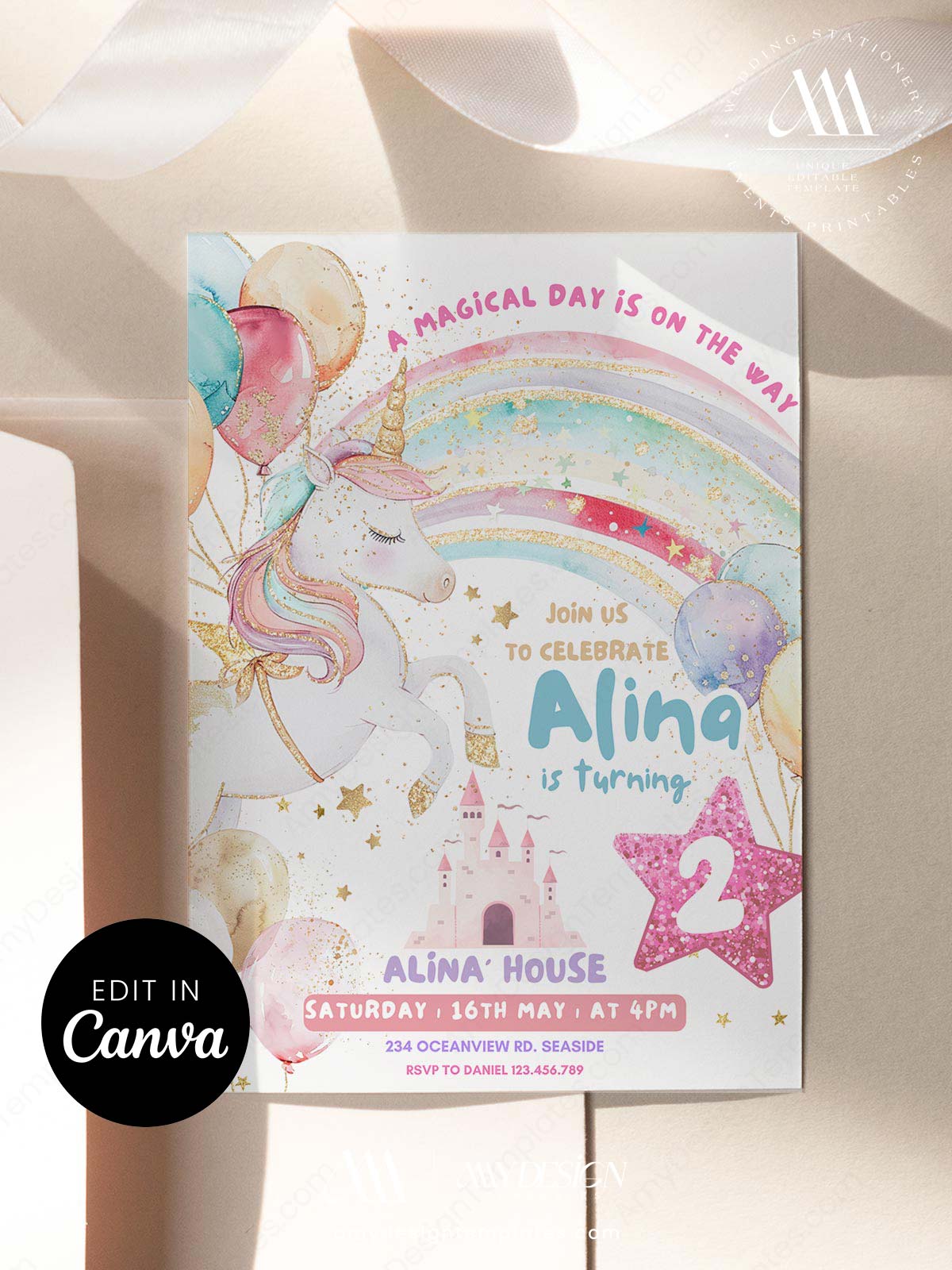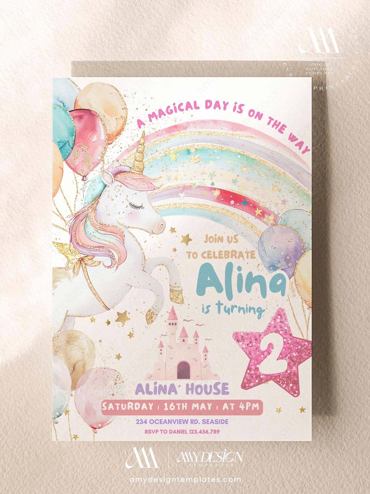 Make your child’s birthday magical! This Elegant Unicorn Birthday Invitation Template features a stunning rainbow and fairytale castle design. As an Editable Canva Design, it is the perfect sophisticated way to invite guests to a whimsical and energetic celebration for your little one.
