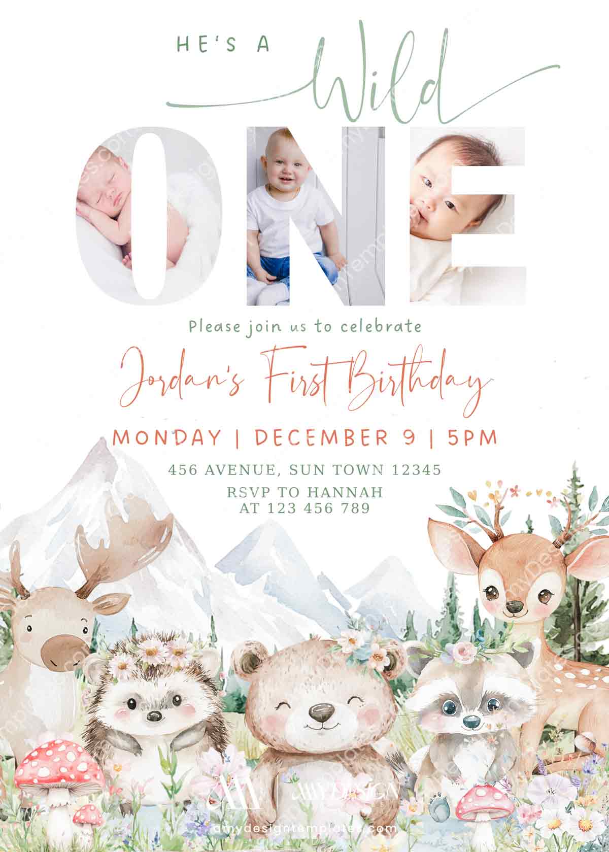 With its unique photo-collage “ONE” typography, this design offers a heartwarming and personalized way to invite loved ones to a truly “wild” first birthday adventure.