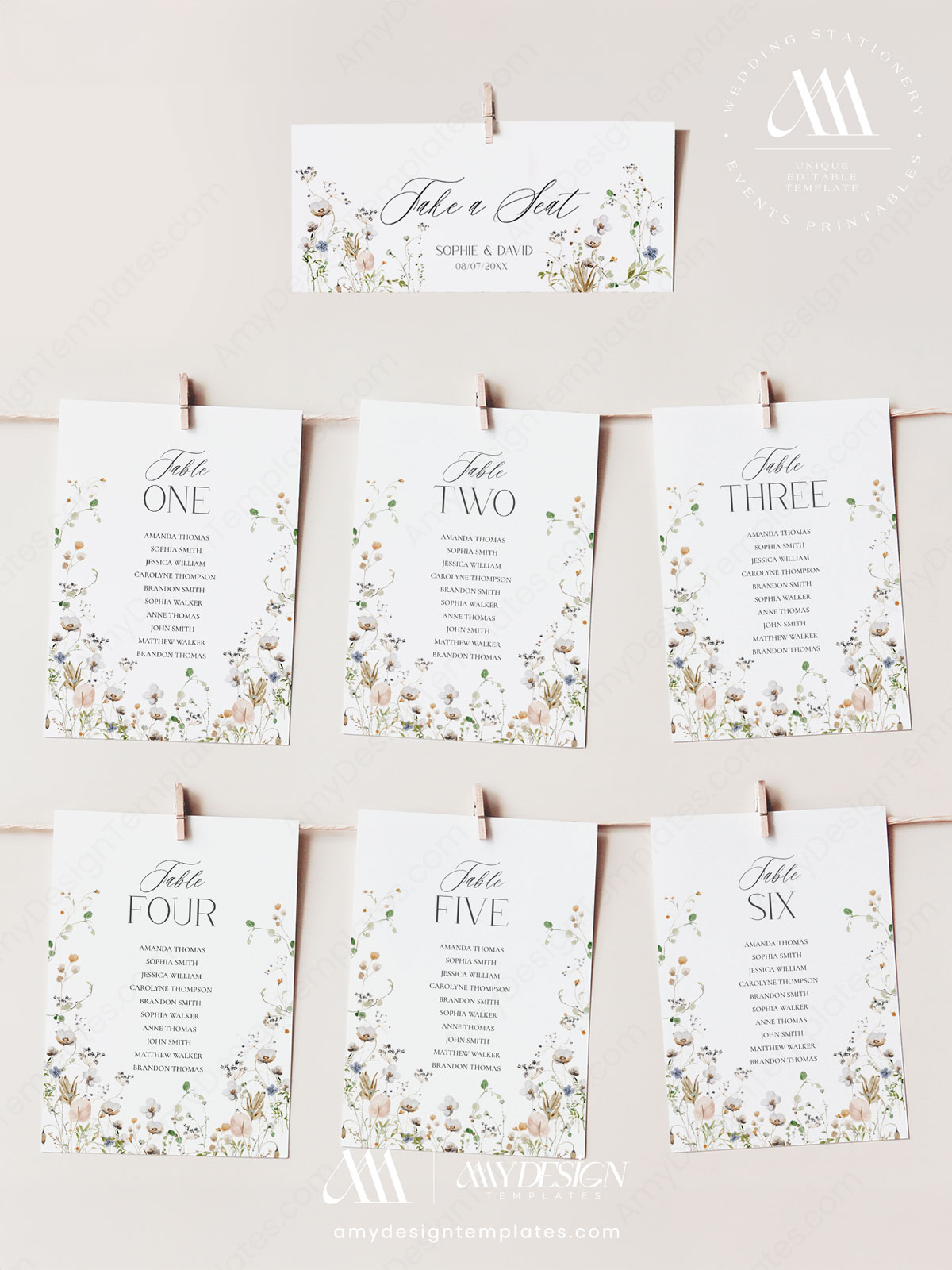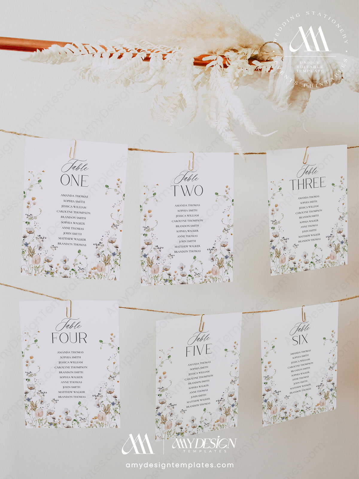 Wildflower Table Seating Chart Template | Wildflower Wedding Table Number Seating Card