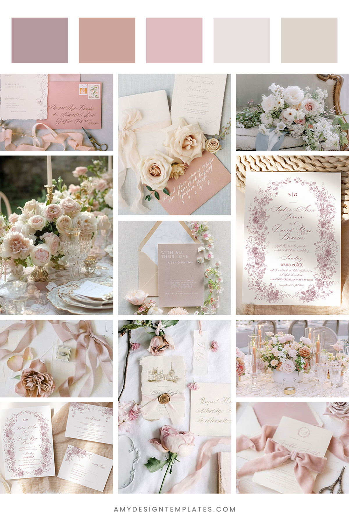 The monochromatic dusty rose (or mauve) color palette is warm, feminine, and incredibly romantic. A modern monogram at the top adds a personal touch, blending contemporary style with vintage charm.