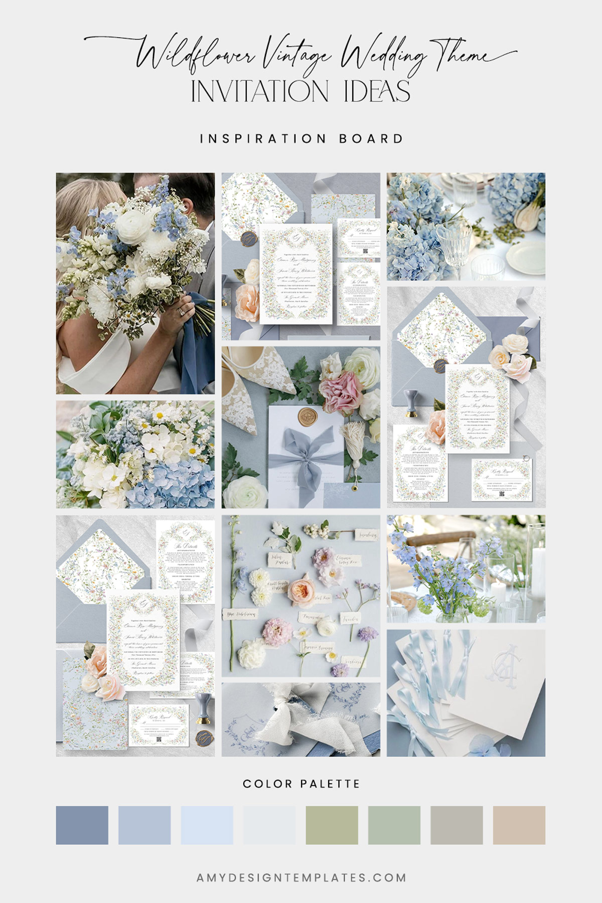 This suite captures the romance of a whimsical, sunlit garden party. While the dusty blue envelope sets a classic tone, the invitation itself is alive with a delicate mix of pastel wildflowers in shades of blue, yellow, and pink.